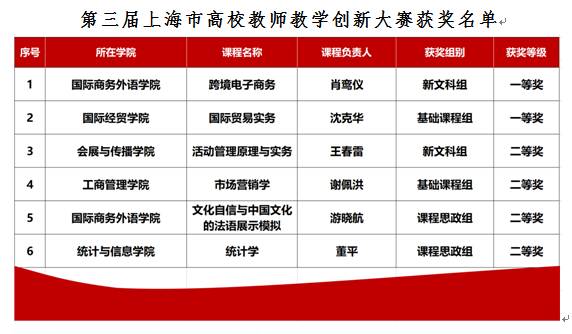 我校遴选推荐的6名教师均在比赛中获奖。其中,国际经贸学院沈克华老师获基础课程组一等奖,国际商务外语学院肖鸾仪老师获新文科组一等奖,工商管理学院谢佩洪老师获基础课程组二等奖,会展与传播学院王春雷老师获新文科组二等奖,国际商务学院游晓航老师、统计与信息学院董平老师获课程思政组二等奖。同时,我校获得优秀组织奖。