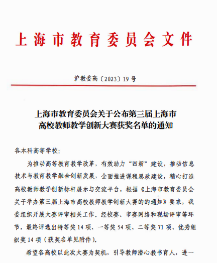 近日,上海市教育委员会公布了第三届上海市高校教师教学创新大赛获奖名单。