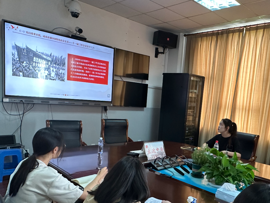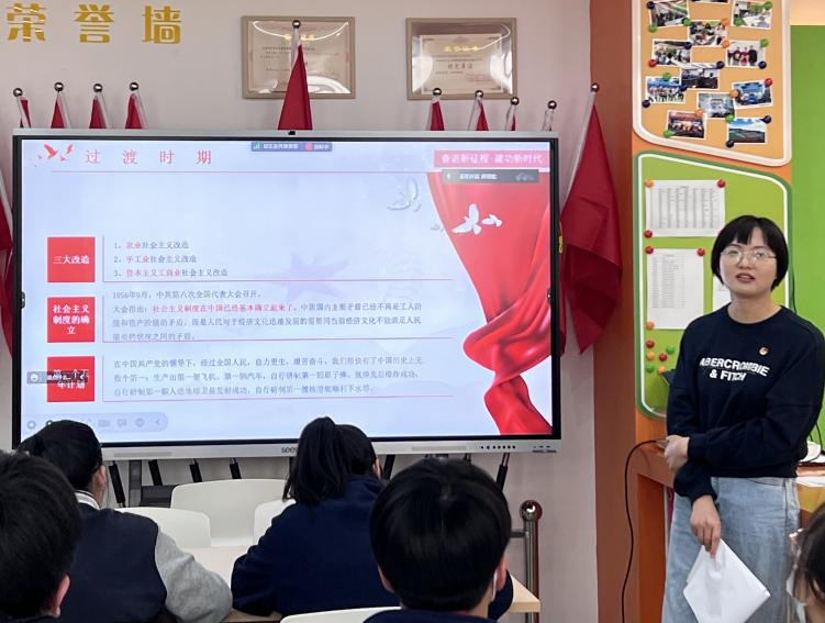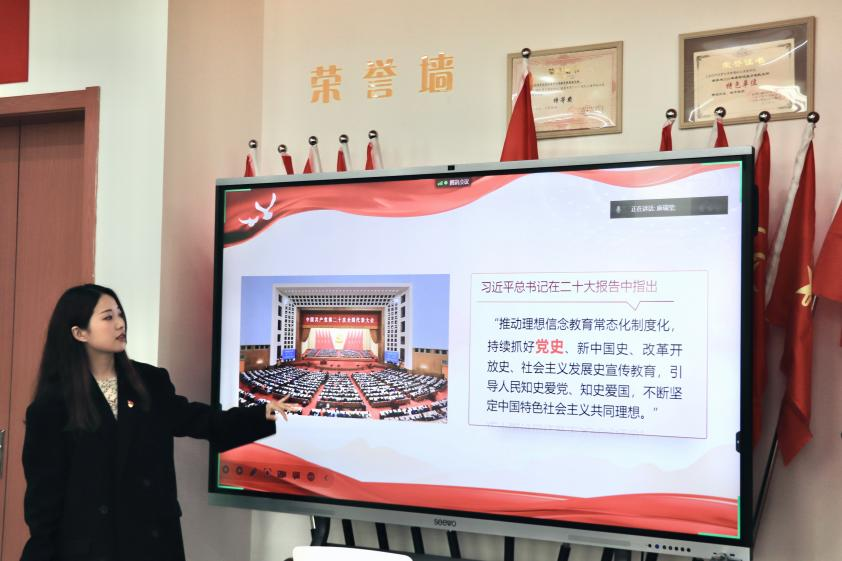 结合“四史”宣讲党的二十大。在上海对外经贸大学附属松江实验学校花园分校的课堂上,侯文静以党的二十大报告中“推动理想信念教育常态化制度化,持续抓好党史、新中国史、改革开放史、社会主义发展史宣传教育,引导人民知史爱党、知史爱国,不断坚定中国特色社会主义共同理想”为切入点,以时间为轴,用党史故事与校史资源将中国共产党的百年奋斗历程串联起来,既加深了同学们对于党的二十大报告中“坚持和加强党的全面领导”重要论述的认识,又在同学们心里埋下爱党、爱国、爱校的种子。