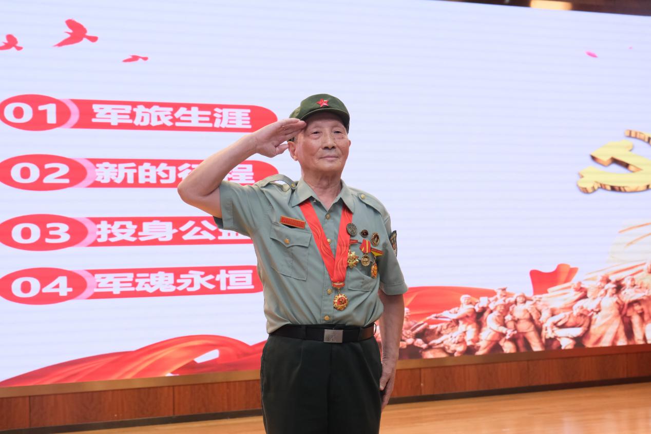 老兵褚康龄,1961年入伍,曾参加保卫核基地战斗和援越抗美战争,回国后参加过淮河抗洪抢险战斗。褚老师以一曲《我是一个兵》高歌开场,谈起自己的军旅生涯,他用“一、二、三、四、五”来概括,即一次“选择”、两回“蒸发”、三款“军装”、四临“死亡”、五写“血书”。他深情回忆了高中起参军入伍,到参加大西北核基地保卫战、援越抗美战争,归国后参加过淮河抗洪抢险战斗任敢死队长,率领一百多位勇士与洪水博斗,三天三夜浸泡在洪水中堵漏的故事。“我曾是一名癌症晚期患者,但我依然选择在多彩的公益活动中做有益的事、做有意义的事,永葆初心举党旗,胸怀军魂育后辈!”