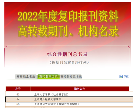 近期,学术期刊社喜报连连。2023年4月,中国人民大学书报资料中心发布2022年度复印报刊资料高转载期刊名录,《上海对外经贸大学学报》入选“2022年复印报刊资料高转载期刊名录”(TOP100);2023年6月,《国际商务研究》再次入选南京大学中国社会科学研究评价中心CSSCI(2023-2024)扩展版来源期刊;此前《国际商务研究》和《上海对外经贸大学学报》已成功入选2022年中国社会科学院核心期刊扩展版;2023年3月,中南财经政法大学中文社科转载信息检索中心发布2022年检索报告,《国际商务研究》和《上海对外经贸大学学报》2022年分别被转载文章10篇和9篇,在全国62所经济类院校学报中排名第24位和第28位;另外,学术期刊社的吴素梅和梁丽华被评为第七届华东地区优秀期刊工作者(优秀编辑)。