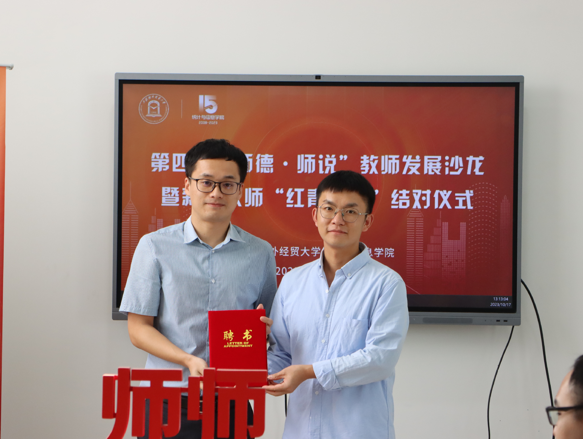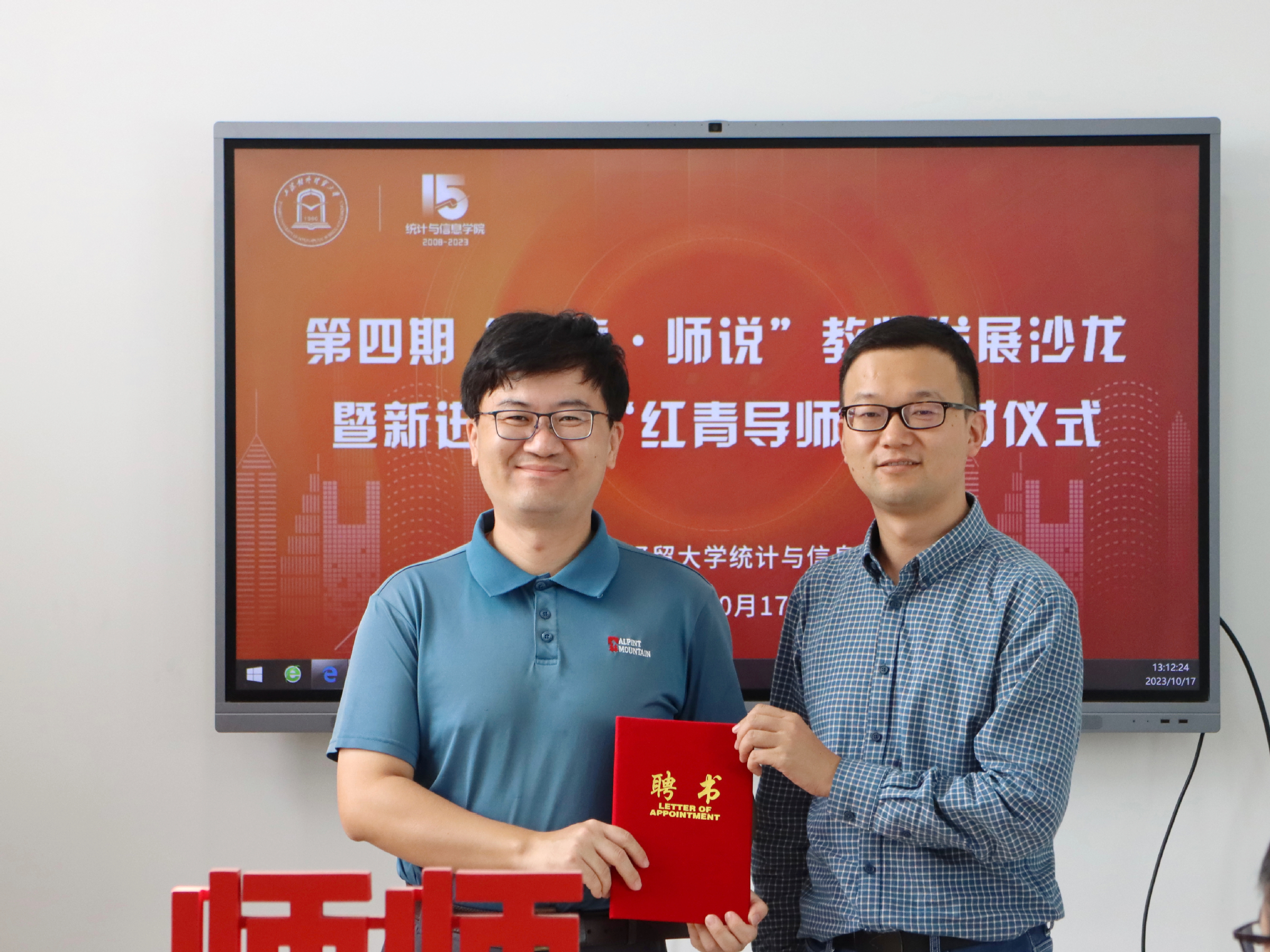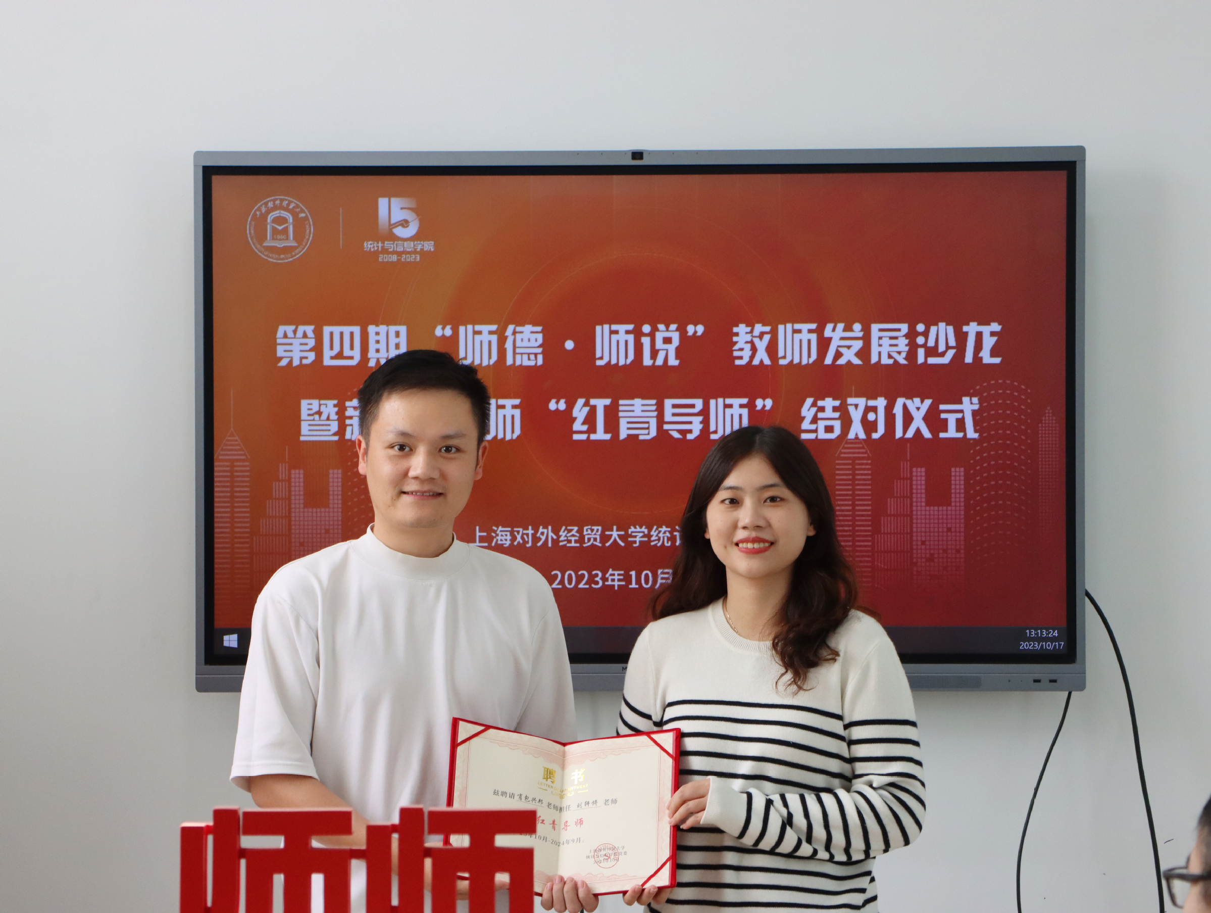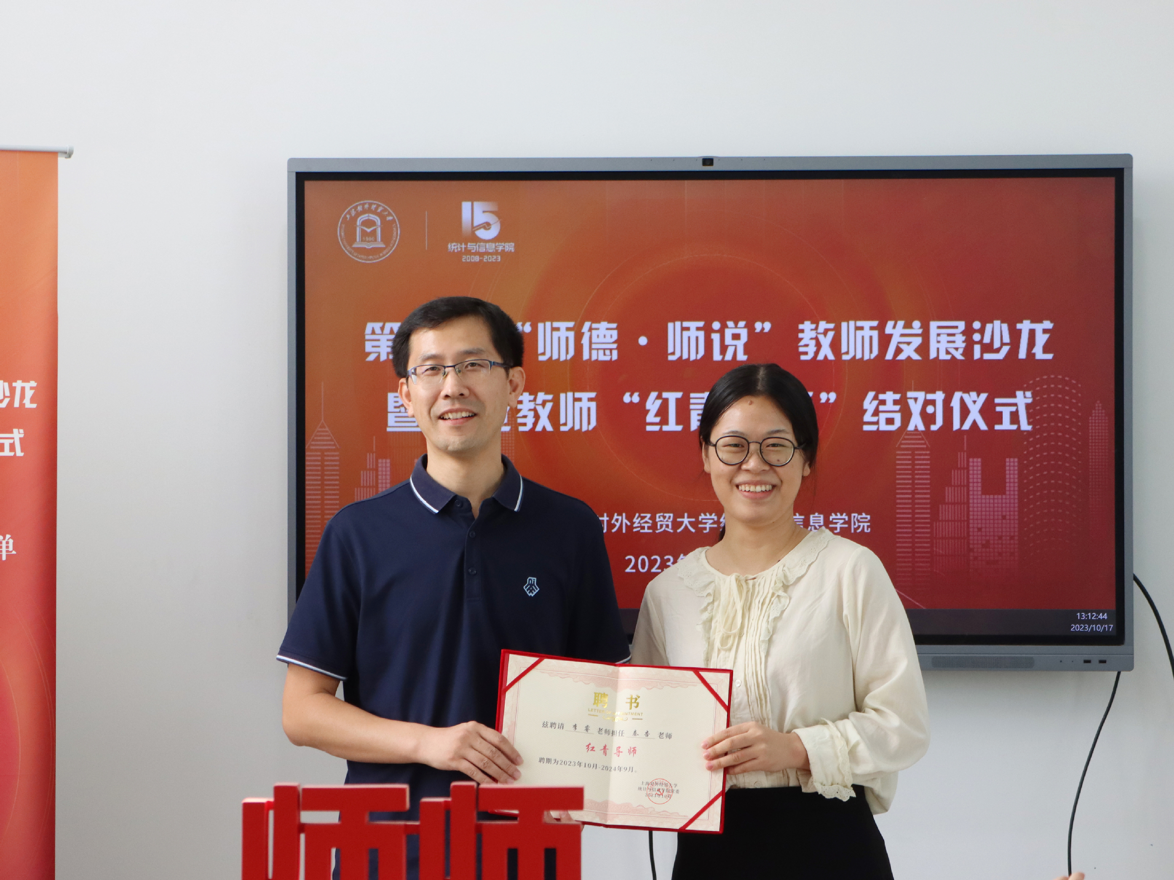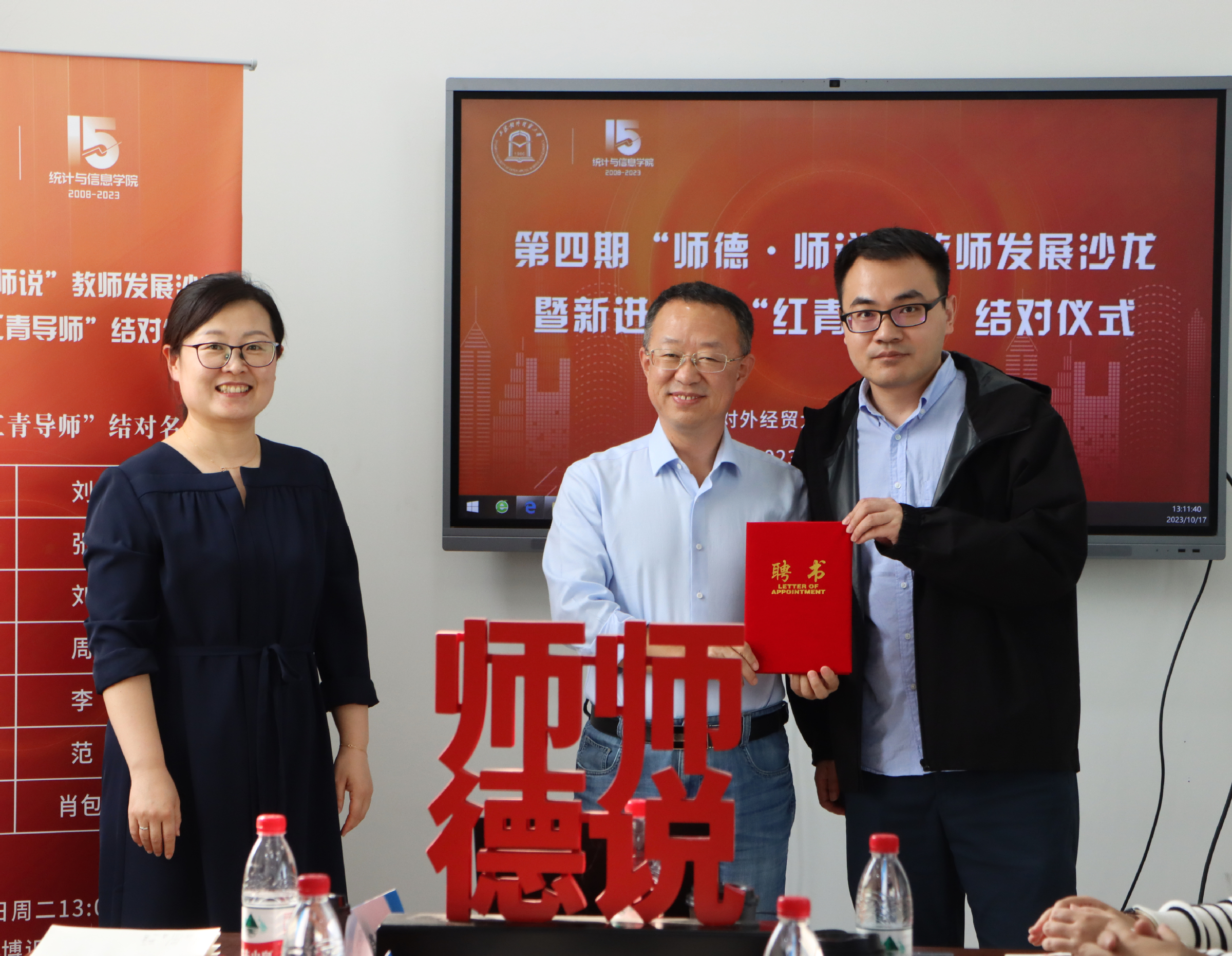 10月17日下午,统计与信息学院举办第四期“师德·师说”教师发展沙龙暨新进教师“红青导师”结对仪式,校党委教师工作部副部长、人事处副处长张莉莉,学院领导班子,薛楷杰、许文超、汪毅、孙强、秦杏、彭鹏、刘轩旖7位新进教师及带教“红青导师”,教工党支部书记、系主任代表参加活动。活动由统计与信息学院副院长李睿主持。
