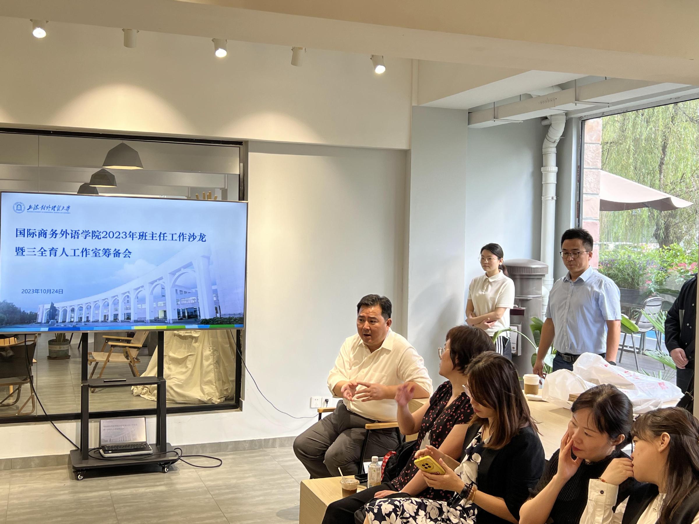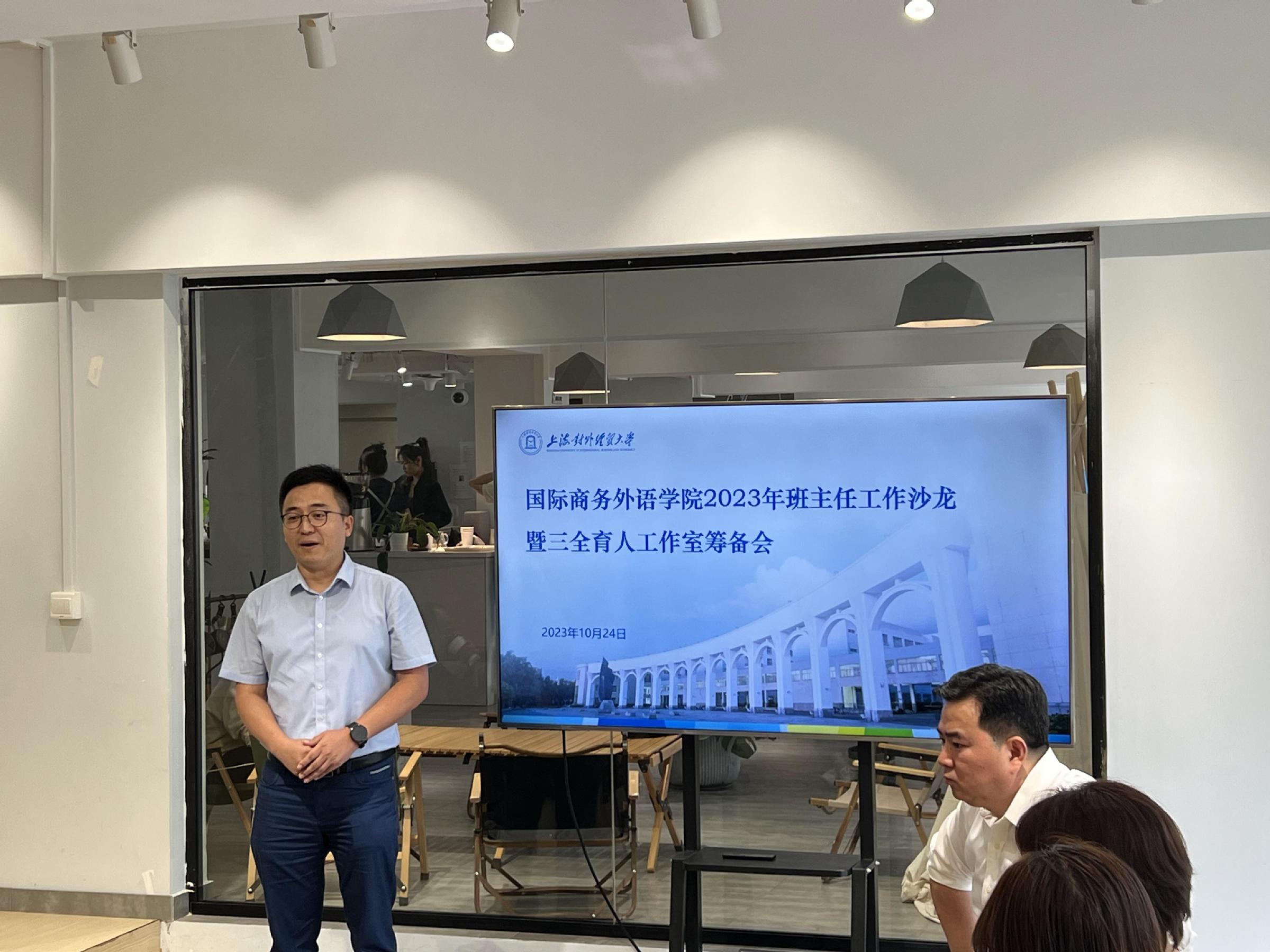 为进一步推进三全育人综合改革,推进学院三全育人力量向社区延伸,将育人资源融入到学生生活一线,10月24日下午,国际商务外语学院在松江校区学生社区举办2023年班主任工作沙龙暨三全育人工作室筹备会,学院党委书记刘根春、副书记徐峰、副院长王玉,2022级、2023级班主任以及相关年级辅导员出席活动。活动由徐峰主持。