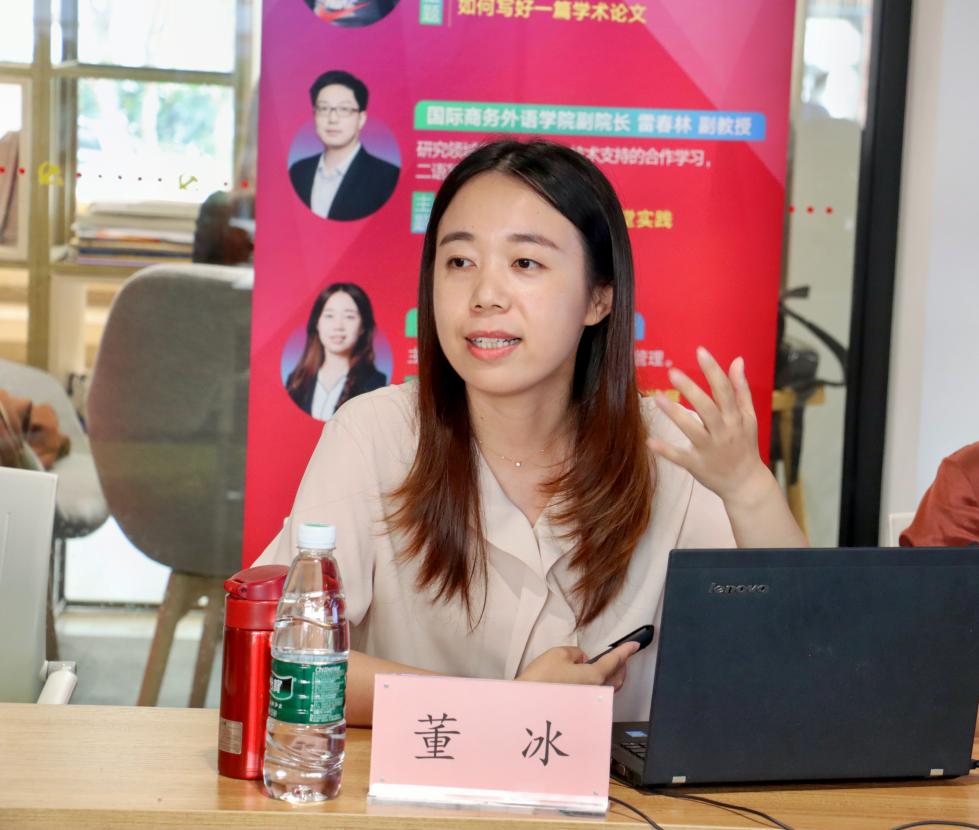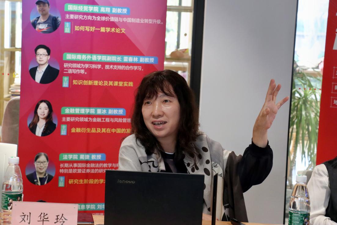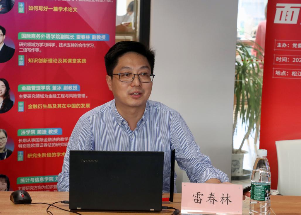 国际商务外语学院副院长雷春林副教授以“知识创新理论及其课堂实践”为题,讲述创新如何发生、如何学习、学什么,从而引出21世纪需要学习与创新的技能,信息、媒体与技术技能,以灰姑娘的故事为例对比启发式教育和灌输式教育的不同,强调知识需要构建与创新。他现场演示如何依托《商学导论》课程,培养学生的深层学习、探究和思辨能力。