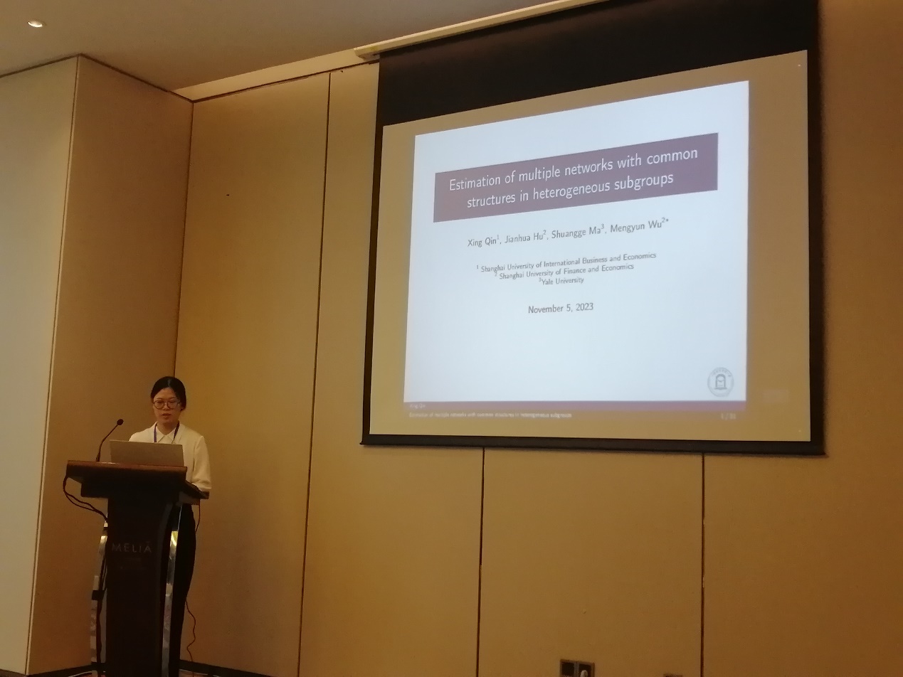 11月5日上午,论坛共举办了6场分会场报告,分会场主题包括:数字经济与金融科技、因果发现和因果推断、航空数据与行业应用、统计推断与生物信息、高维数据与复杂数据、实验设计与抽样理论。共有来自全国各高校的49位专家学者在分会场报告环节做了学术报告。我校统计与信息学院教师秦杏作了主题为《Estimation of Multiple Networks with Common Structures in Heterogeneous Subgroups》的报告,受到现场专家学者的广泛关注。