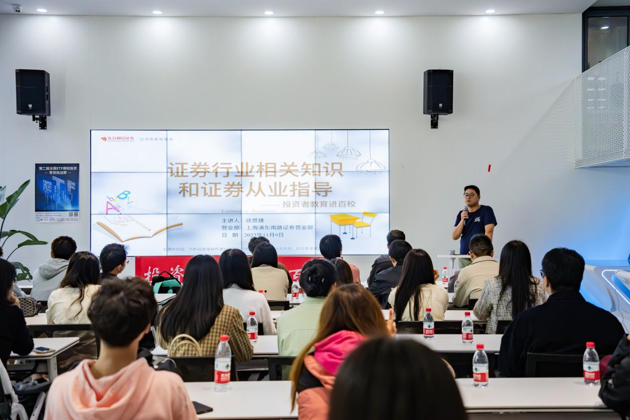 东方财富上海陆家嘴浦东南路证券营业部资深投教讲师徐思捷向同学们介绍了第二届全国ETF模拟投资菁英挑战赛的赛事规则、报名渠道等,鼓励大家积极参赛,深入了解ETF投资知识、学习ETF投资方法、培育理性投资理念,提升金融素养。他以《证券行业相关知识和证券从业指导》为主题,讲述了证券行业在金融机构体系中的职能和业务范围,介绍了证券公司组织架构、岗位构成和技能要求,并以证券从业人员客户经理的一天为例,强调完成日常工作需要专业素质、沟通艺术、获客拓展及人脉累积等能力,为同学们的生涯规划和未来职业发展提供了典型案例参考。