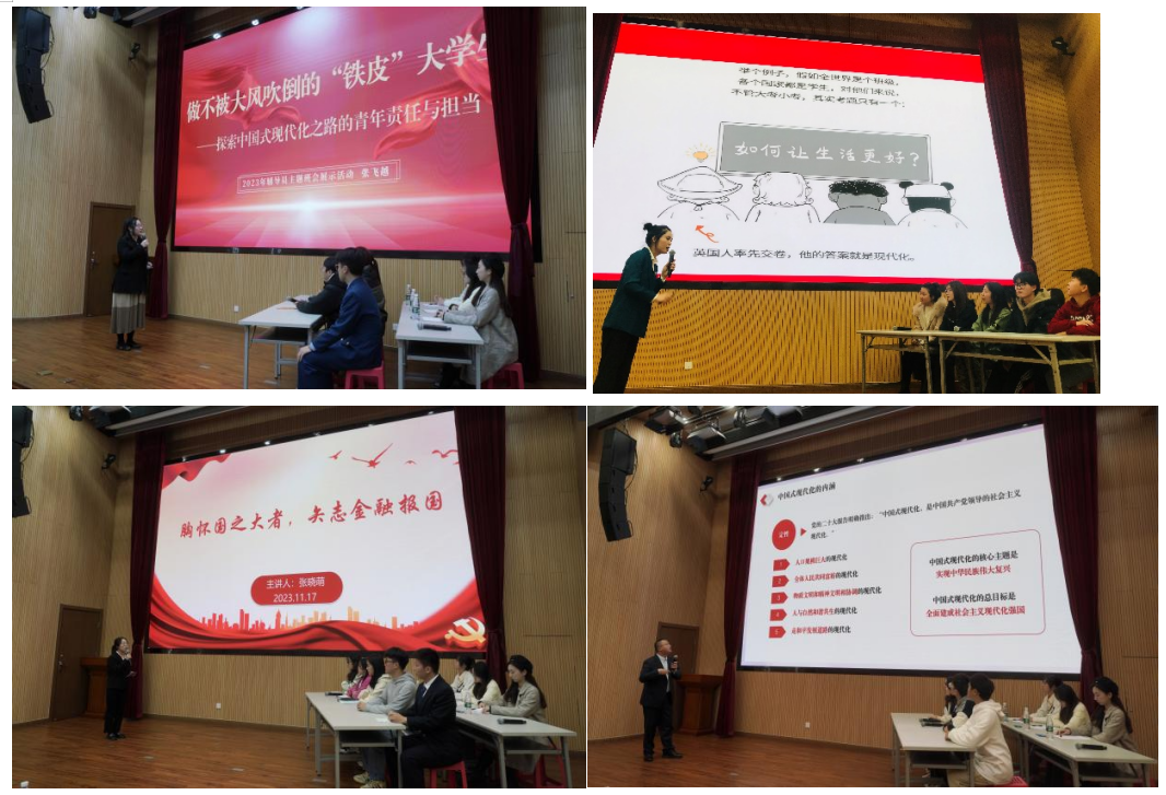经过激烈角逐,国际商务外语学院辅导员张飞越《做不被大风吹倒的“铁皮”大学生——探索中国式现代化之路的青年责任与担当》、国际商务外语学院辅导员罗文秀《中国式现代化:奔赴梦想的中国方案》荣获一等奖,金融管理学院辅导员张晓萌《胸怀国之大者,矢志金融报国》、法学院辅导员闵时涛《行法治之力推进中国式现代化》荣获二等奖。