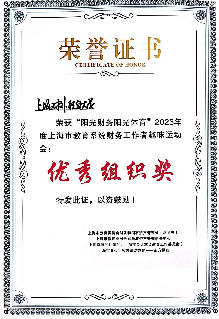 我校财务处的队员们在比赛中展现出了较强的竞技能力,他们充分发挥团队的优势,紧密协作,默契配合,最终荣获“阳光财务阳光体育”2023年度上海市教育系统财务工作者趣味运动会优秀组织奖。