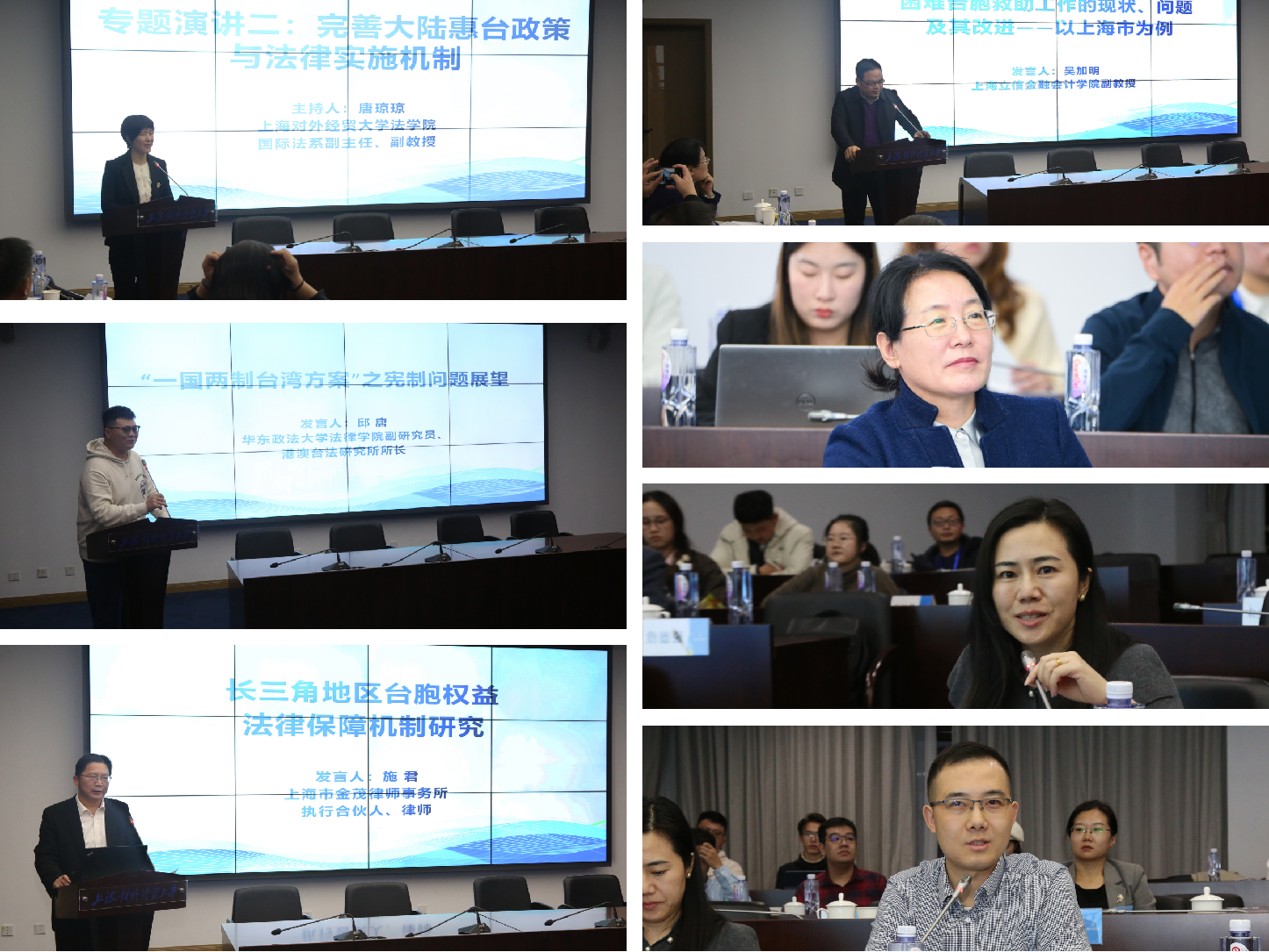 专题演讲二的主题是“完善大陆惠台政策与法律实施机制”,由上海对外经贸大学法学院唐琼琼副教授主持。华东政法大学港澳台法研究所所长邱唐副研究员、上海市金茂律师事务所执行合伙人施君律师、上海对外经贸大学宋锡祥教授以及上海立信会计金融学院吴加明副教授,依次围绕“‘一国两制台湾方案’之宪制问题展望”、“长三角地区台胞权益法律保障机制研究”、“祖国大陆惠台政策落实情况分析及其完善思考”以及“困难台胞救助工作的现状、问题及其改进—以上海市为例”主题进行了发言。上海海关学院王丽英教授、上海市黄浦区人民检察院检察六部副主任薛莉萍、上海市普陀区人民检察院检察六部副主任张楚昊分别作了点评。