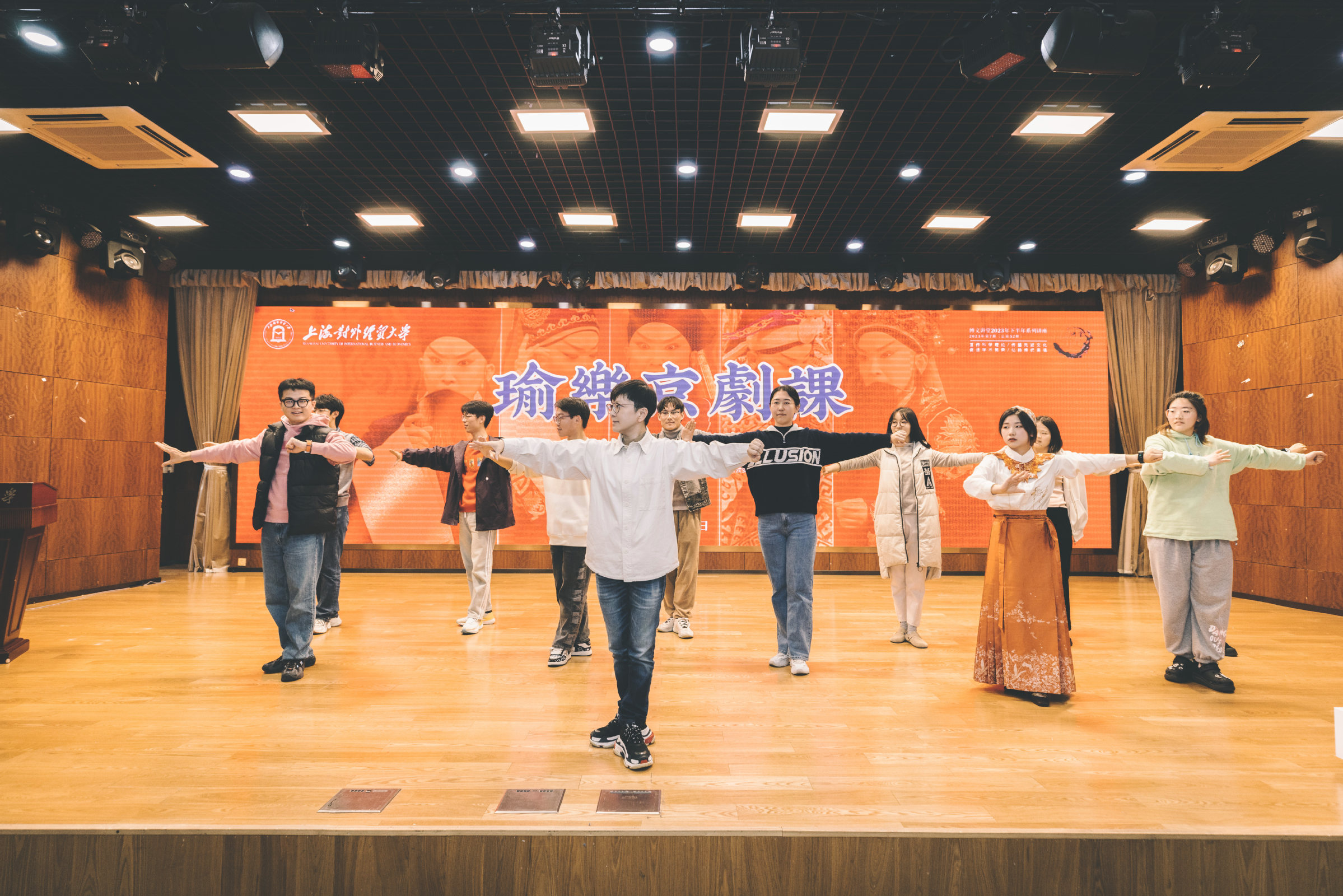 在互动环节,她邀请十位同学上台互动体验京剧“云手”。同学们积极参与,现场气氛活跃。她鼓励在场青年学子日后尝试走入剧场,感受和研习京剧,树立属于中国青年独有的文化自信。