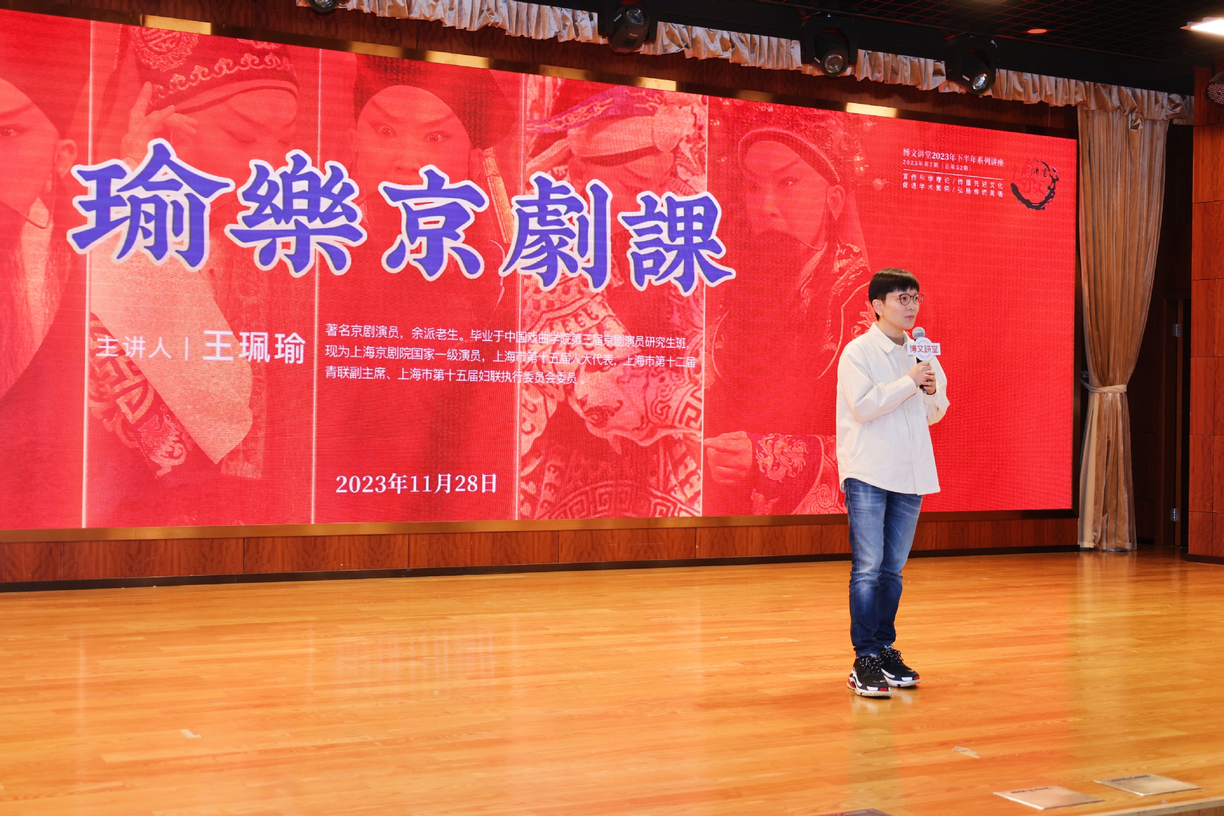 11月28日,学校2023年第七期博文讲堂“瑜乐京剧课”在松江校区图文信息楼507报告厅举行。著名京剧演员,余派老生,上海市第十五届人大代表,上海市第十二届青联副主席,上海市第十五届妇联执行委员会委员王珮瑜且唱且谈,带领在场师生亲近京剧,一同领略传统文化的魅力。