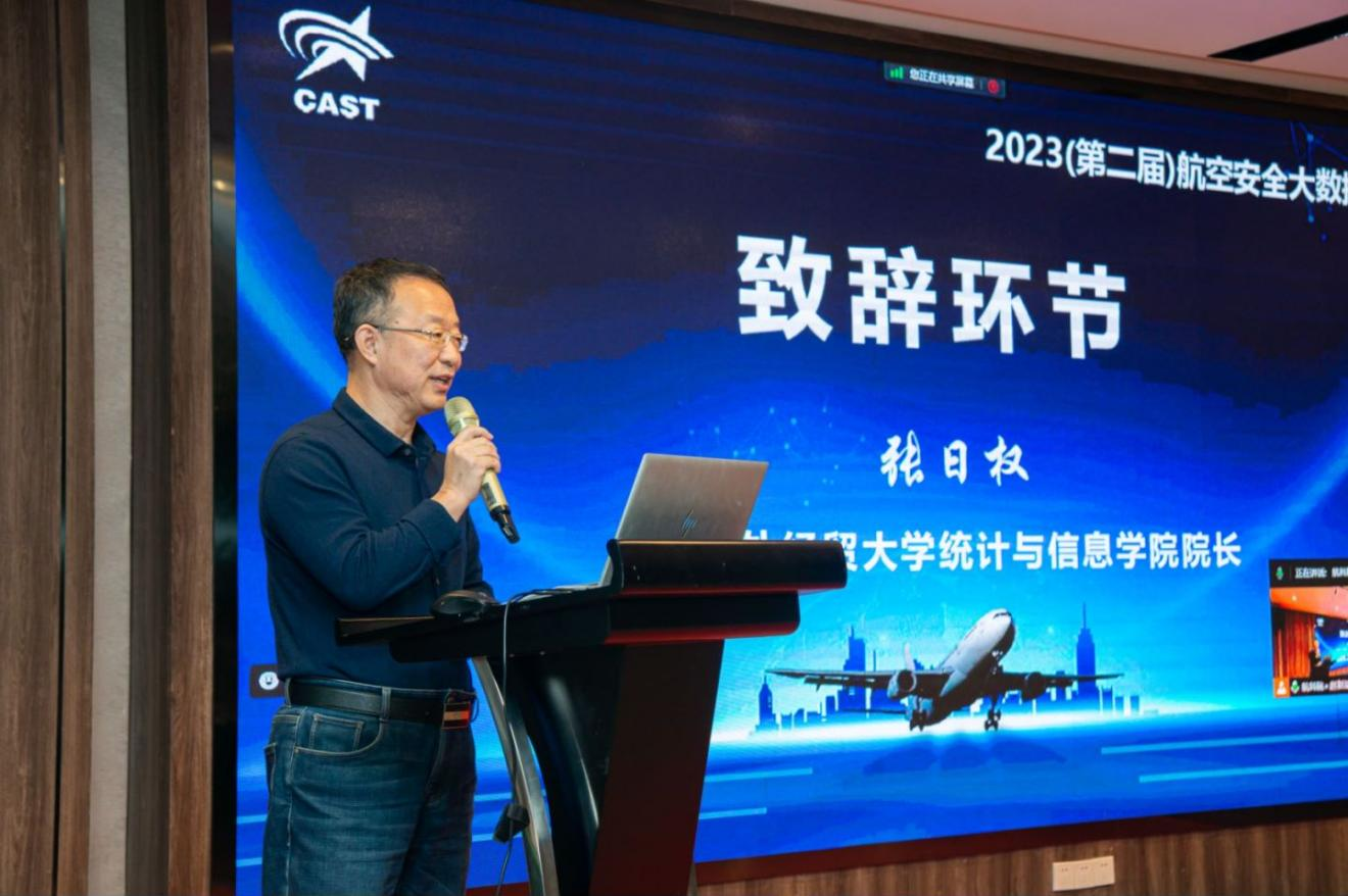 上海对外经贸大学统计与信息学院院长张日权代表协办方致辞。他向莅临参会的专家学者和师生表示热烈欢迎,介绍了学院与中国民航科学技术研究院的合作情况,以及学院在航空安全大数据研究方面所取得的成绩。他充分肯定了双方合作对推进学院高质量发展和统计学科强化建设过程中起到的重要作用,希望与会专家学者深入交流、携手共绘航空安全大数据的远景宏图。