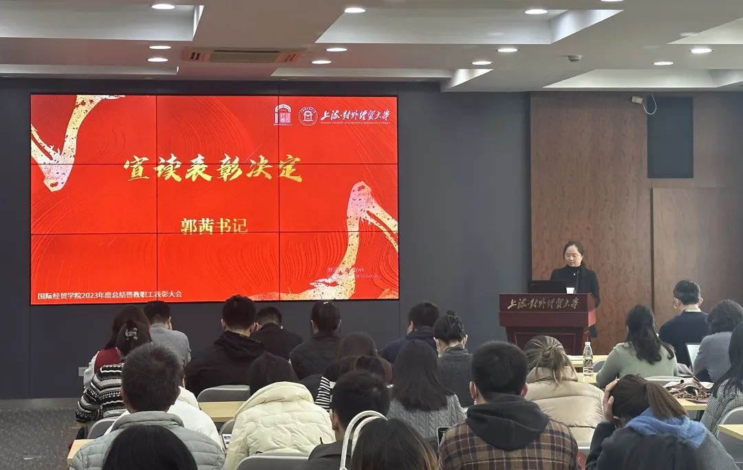 1月18日,国际经贸学院在松江校区图文信息楼503会议室隆重举行2023年度总结表彰大会,学院领导班子成员、全体教职工参加会议由学院党委副书记陈雪主持。