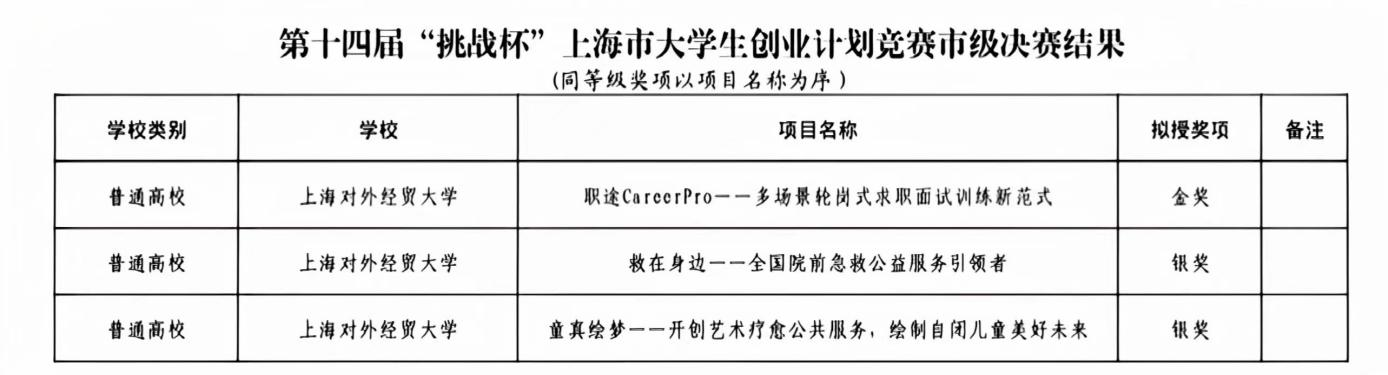 近日,由共青团上海市委员会、上海市教育委员会、上海市人力资源和社会保障局、上海市科学技术协会、上海市学生联合会主办,东华大学承办的第十四届“挑战杯”上海市大学生创业计划竞赛决赛落下帷幕,我校3个项目分获金奖1项,银奖2项。