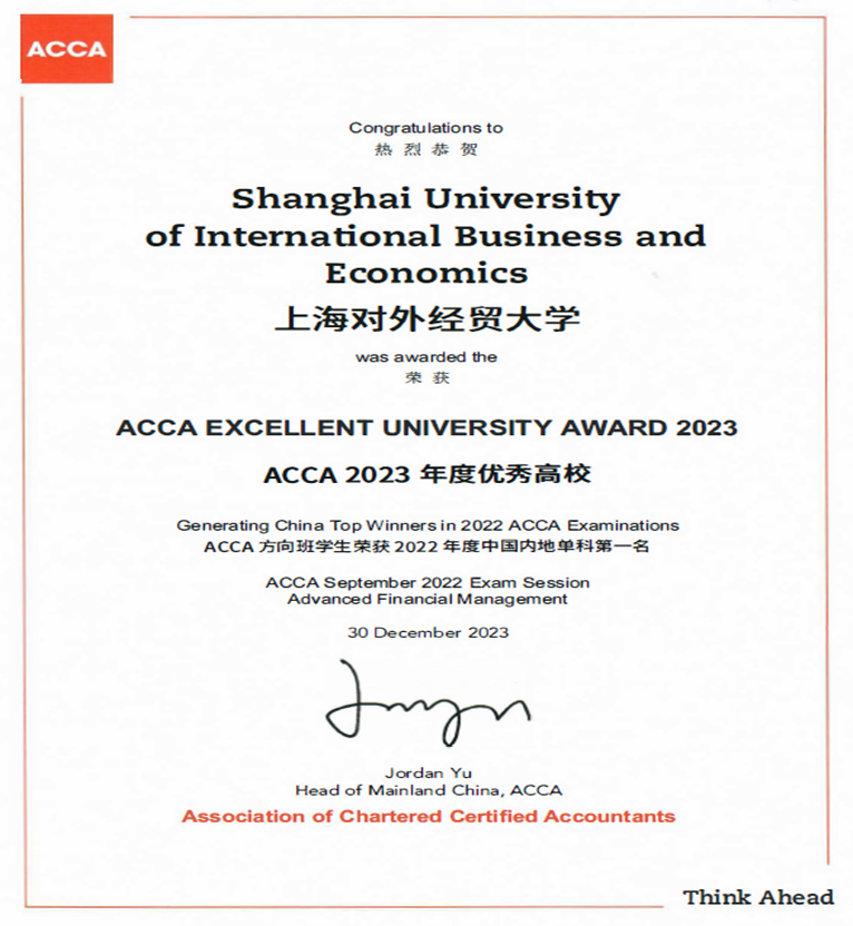 截至目前,我校在ACCA项目中已获得1门次全球单科第一,10门次单科中国内地第一和3门次ACCA方向班全国通过率第一,4名教师获得全国“ACCA优秀专业指导教师”称号,并荣获ACCA 2023年度优秀高校。