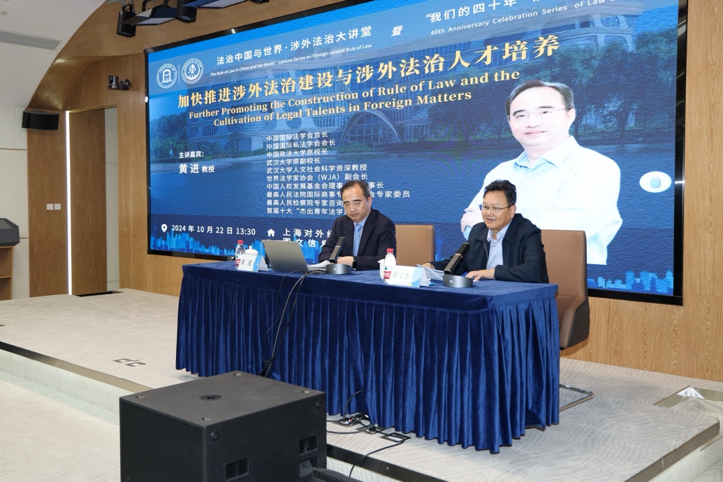 在庆祝上海对外经贸大学法学院四十华诞之际,为深入学习贯彻习近平法治思想和习近平总书记关于加强涉外法治工作的重要论述,加强我校涉外法治人才协同培养基地建设,1022日下午,法学院邀请中国国际法学会会长、中国政法大学原校长黄进教授,在“法治中国与世界·涉外法治大讲堂”上作“加快推进涉外法治建设与涉外法治人才培养的专题讲座。讲座前,校党委书记祁明教授与黄进教授进行亲切交谈,并请黄进教授对我校涉外法治人才协同培养基地建设给予持续性和建设性的专家指导。法学院班子成员陪同接待。