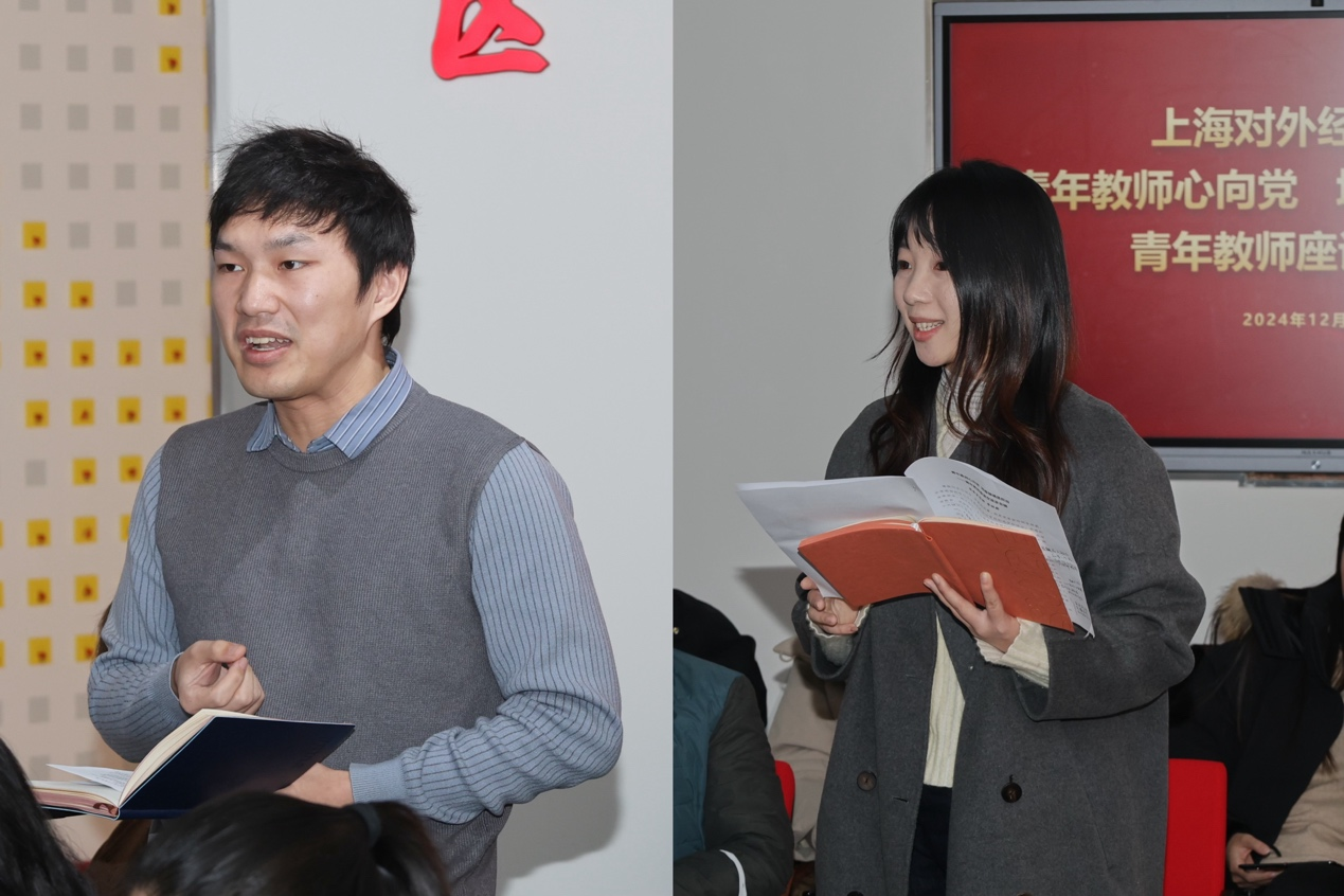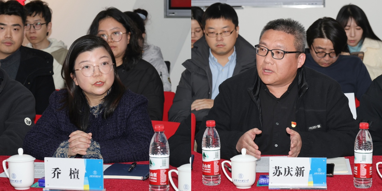 会上,法学院党委书记乔檀、国际经贸学院电子商务系党支部书记苏庆新分别围绕学院对青年教师的政治引领和培养、支部凝聚助力青年教师成长等作交流发言。