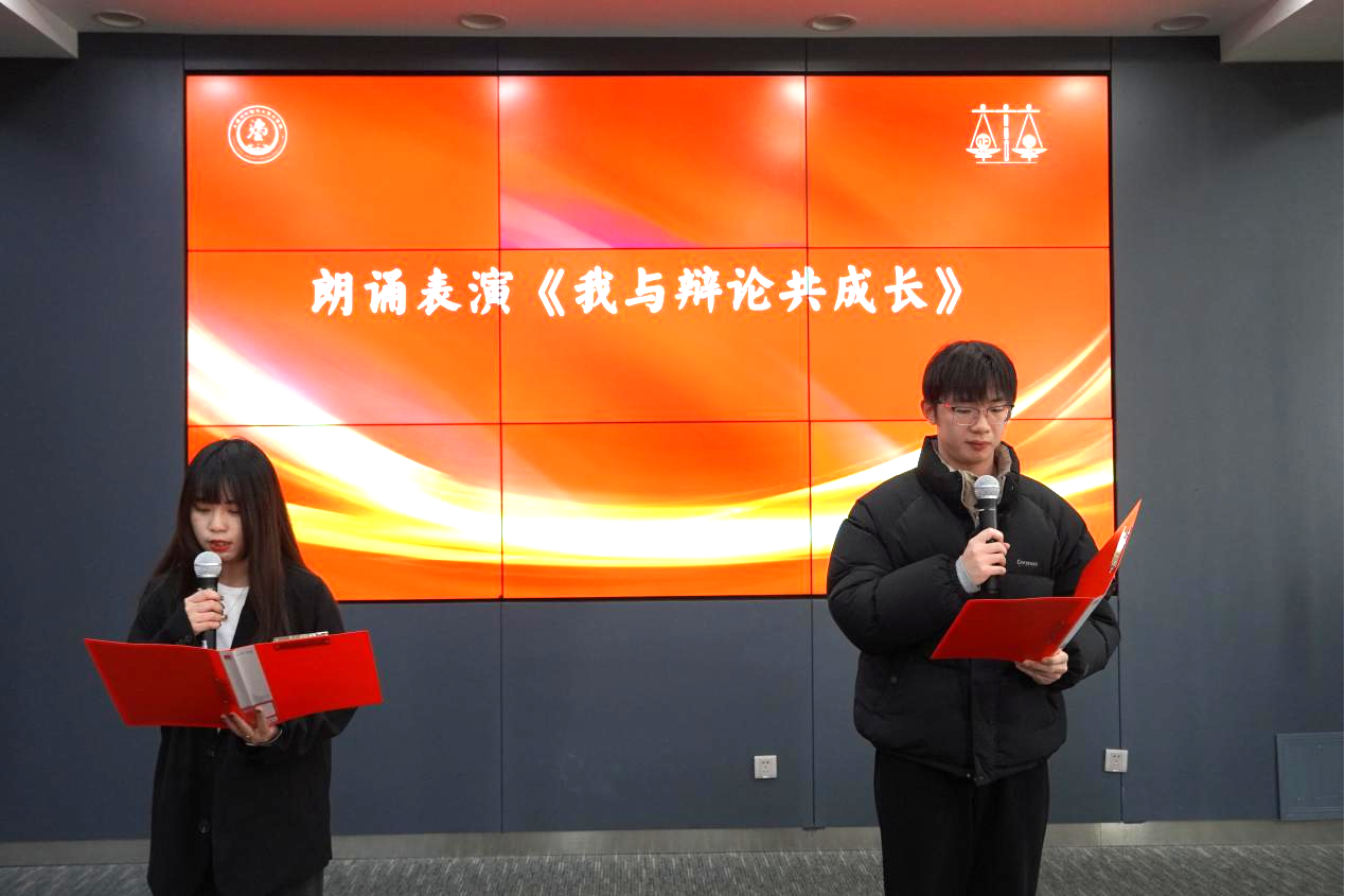 法学院学生陆佳骏、童巧通过朗诵节目《我与辩论共成长》,传递了辩论在促进学生成长中所发挥的作用。