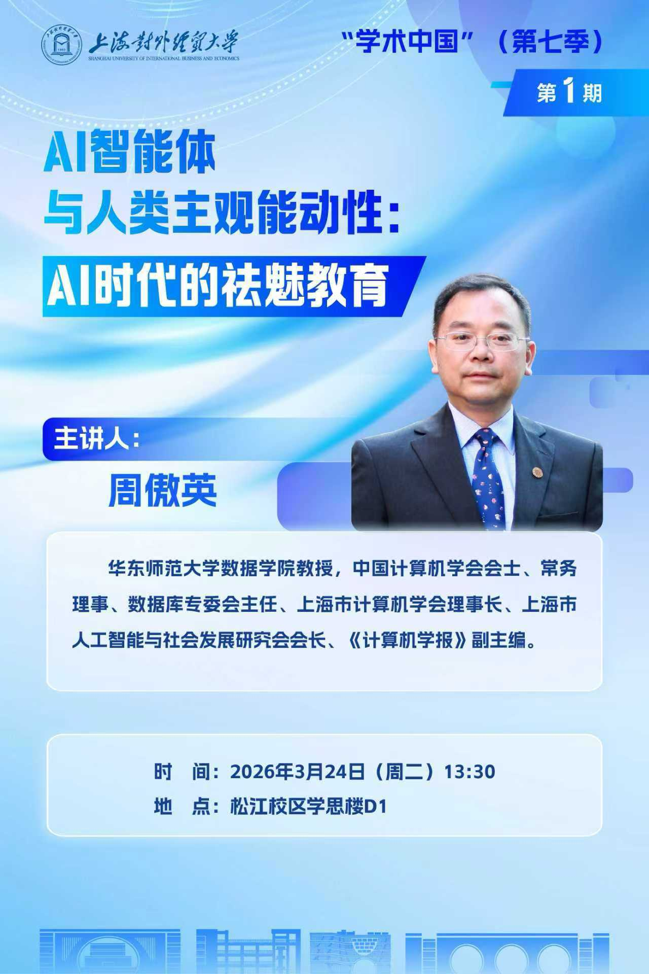 3月24日,由研究生院、党委研工部联合主办的“学术中国”(第七季)首场讲座在松江校区学思楼D1举行。华东师范大学周傲英教授应邀作题为“AI智能体和人类主观能动性:人工智能时代的祛魅教育”的学术报告。