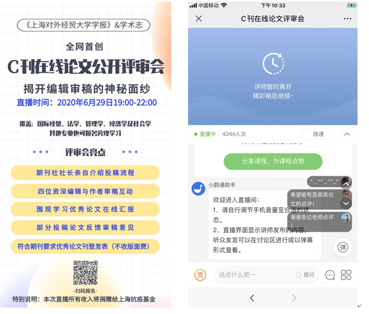 值得一提的是,本次直播象征性地向观众收取的每位1元的所有收入,由“学术志”平台捐赠给上海抗疫基金。这也算是学术期刊社和《上海对外经贸大学学报》编辑部为上海的抗疫事业所尽的绵薄之力。
