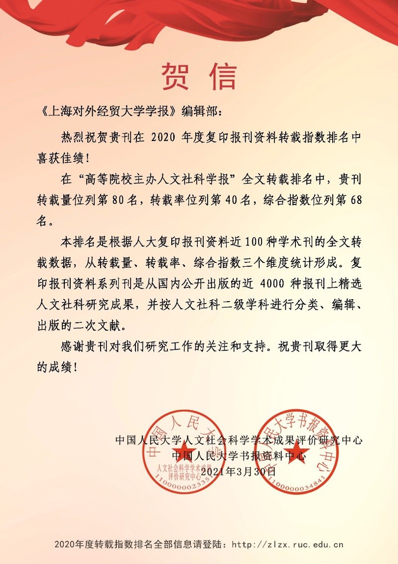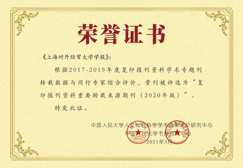此外,根据中国人民大学人文社会科学学术成果评价研究中心和中国人民大学书报资料中心发布的“复印报刊资料重要转载来源期刊(2020版)”,《上海对外经贸大学学报》继续入选“复印报刊资料重要来源期刊”。