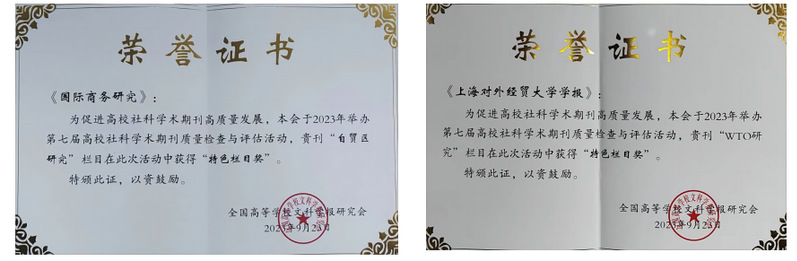 学术期刊社以栏目建设为把手,两本期刊通过聚焦学术热点、主办专题学术会议、积极参加全国性会议、邀请名家组稿等方式,着力打造逐步凸显刊物优势特色栏目。2023年9月,全国高等学校文科学报研究会举办第七届高校社科学术期刊质量检查与评估活动,我社两本期刊的“自贸区研究”和“WTO研究”栏目获得“特色栏目奖”。