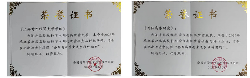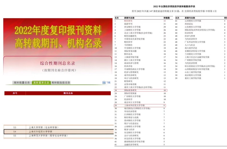 2023年3月,中南财经政法大学中文社科转载信息检索中心发布2022年检索报告,《国际商务研究》和《上海对外经贸大学学报》两本刊物2022年分别被转载文章10篇和9篇,在全国62所经济类院校学报中排名第24位和第28位。2023年4月,中国人民大学书报资料中心发布2022年度复印报刊资料高转载期刊名录,《上海对外经贸大学学报》入选“2022年复印报刊资料高转载期刊名录”(TOP100)。