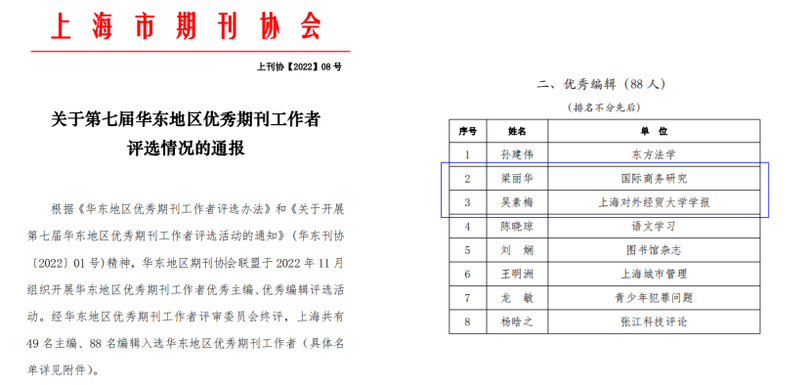 2022年12月,第七届华东地区优秀期刊工作者评选结果公布,学术期刊社的吴素梅和梁丽华被评为第七届华东地区优秀期刊工作者(优秀编辑)。