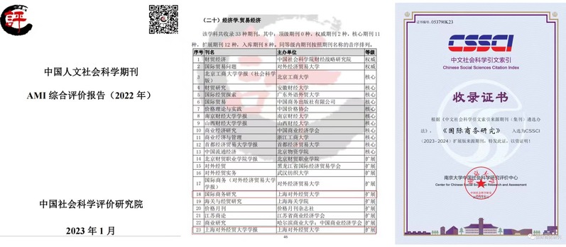 继《国际商务研究》和《上海对外经贸大学学报》成功入选2022年中国社会科学院核心期刊扩展版之外,2023年6月,《国际商务研究》再次入选南京大学中国社会科学研究评价中心CSSCI(2023-2024)扩展版来源期刊。