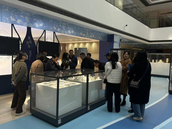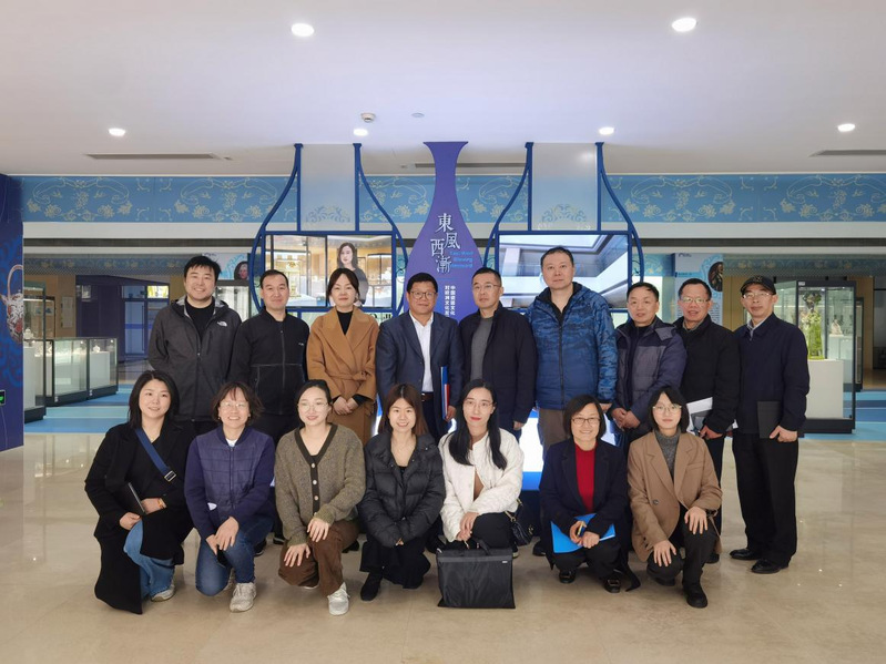 座谈交流结束后,双方进行了调研参观活动。第三党支部书记傅杰带领调研队伍来到东方出版中心产业园区参观学习,为大家详细介绍了东方出版中心的发展历程、图书出版、行业影响力等建设成果。随后,东方出版中心一行来到上海对外经贸大学古北校区,一起参观了校园及学校博物馆,参观了“东风西渐—中国瓷器文化对欧洲文化发展的影响”的主题展览,博物馆老师带领大家了解了“东风西渐”展品与学校的历史底蕴、办学理念,体会了中华文化在校内外多层次、多领域的传播。