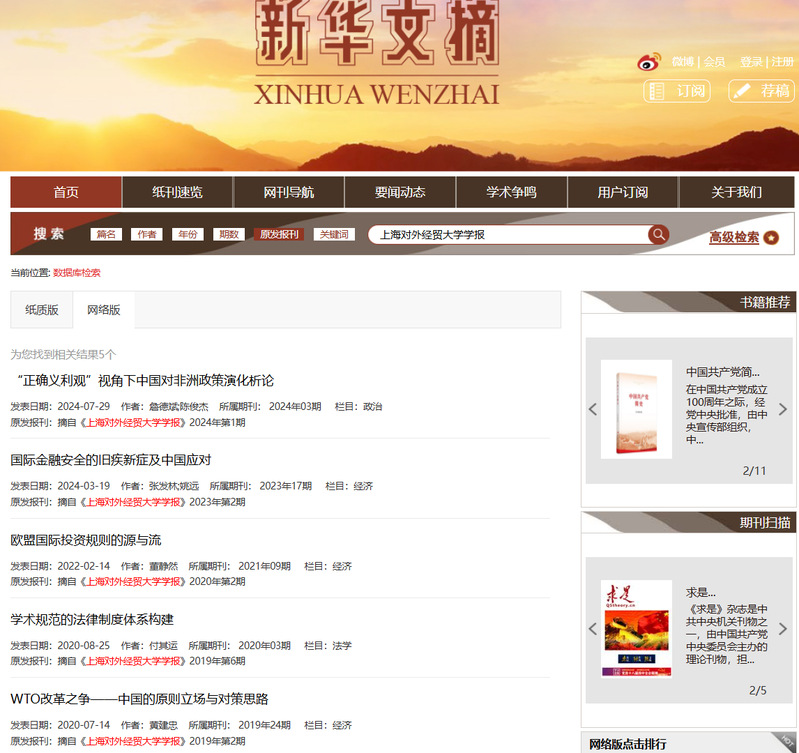 近年来,《上海对外经贸大学学报》刊发的5篇文章先后被《新华文摘》网络版全文转载。这5篇文章分别是上海对外经贸大学詹德斌和陈俊杰撰写的“‘正确义利观’视角下中国对非洲政策演化析论”,南开大学张发林和姚远撰写的“国际金融安全的旧疾新症及中国应对”,上海对外经贸大学董静然撰写的“欧盟投资规则的源与流”,西南政法大学付其运撰写的“学术规范的法律制度体系构建”,以及上海对外经贸大学黄建忠撰写的“WTO改革之争——中国的原则立场与对策思路”。