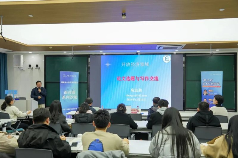 高运胜教授以《开放经济领域论文选题与写作交流》为题,从论文写作的基本框架、如何确定好的题目、问题提出、实证分析等方面讲解论文写作范式及注意事项,为培训班学员做了系统性的指导。