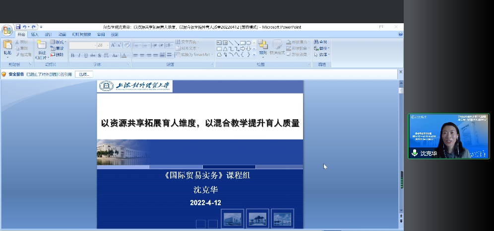 国家级虚拟仿真实验教学一流课程《跨境校际合作下的国际贸易实战虚拟仿真实验》负责人、实验教学中心程洁副教授结合当前国际贸易实战虚拟仿真实验的建设思路,介绍了国际合作框架下虚拟仿真实验课程中的,着重讲解了国际合作框架下虚拟仿真实验中“虚实结合”的三个维度,做到增强课程亮点,建设符合本科生培养目标和层次的课程。