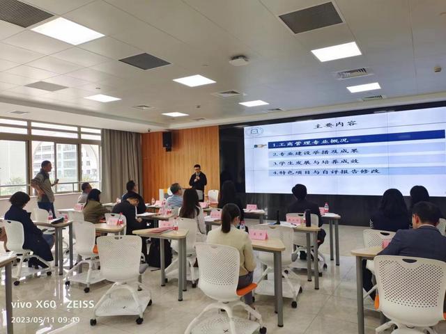 按照专业自主评估专家组进校考察流程,企业管理系的系主任戴永辉老师对工商管理专业的建设情况进行了汇报,分别从工商管理专业概况、专业建设举措和成果、学生发展与培养成效以及项目特色等四个方面进行了汇报介绍。汇报后,专家组与戴永辉老师及教师代表就相关问题进行了交流和沟通。然后专家组根据分工,分别安排专家去课堂听课、开展教师座谈会以及在校生座谈会以及毕业生线上座谈会。下午,三位专家分工合作,通过抽查课程试卷、教学方案、毕业论文、支撑材料等对本科人才培养的过程进行考察。
