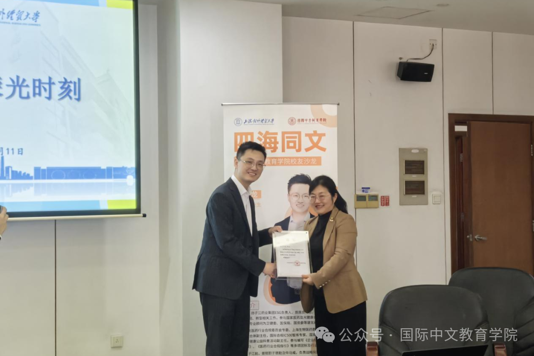 4月11日中午,国际中文教育学院在松江校区图文信息楼501会议室举办“四海同文”校友沙龙。学院邀请首届对外汉语专业校友、扬子江药业集团ESG负责人兼首席合规官王尊龙担任主讲嘉宾,学院院长王艳艳、副院长陆婷瑶、党总支副书记虞娅娜、专业主任李春桃、学院团总支(筹备组)书记严润杰及学院师生代表出席沙龙。