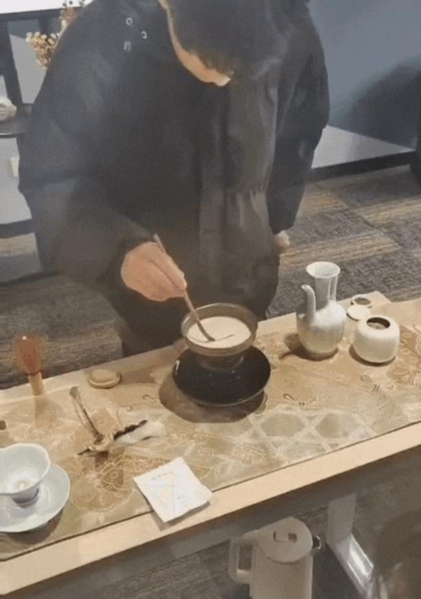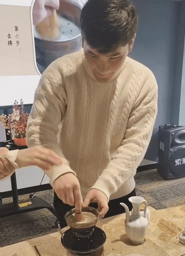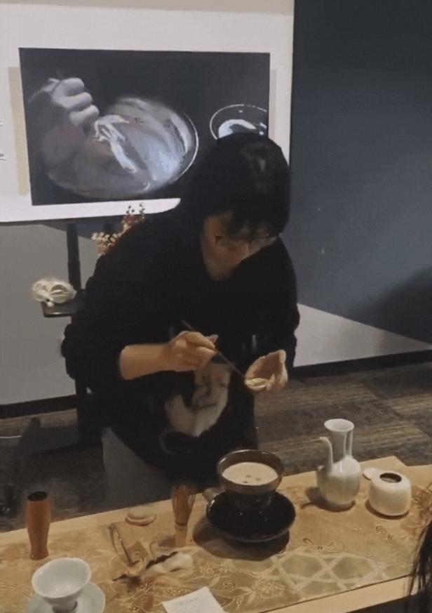 接下来,汪老师指导留学生将茶粉倒入器皿中,加入少许水,磨成膏状。在这一过程中,汪老师还强调手指的动作规范,确保每个人都能准确掌握这一传统技艺的重要细节。在加水之后,泡沫的形成让留学生的兴趣愈加高涨。老师指导留学生每加一次水都要击打茶面打出泡沫。而后,在泡沫绵密但仍有气泡时,要换另一种方式在茶面转圈使泡沫变得细腻,这体现了茶道中对细节的严格要求与关注。