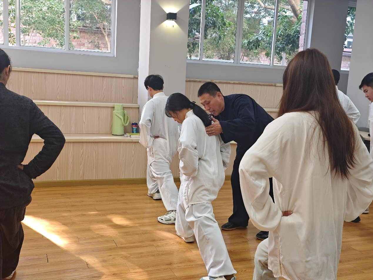 在武当太极拳的练习过程中,熊老师为学生们讲解太极拳的基本动作要领和呼吸方法,先带学生们学了热身操,然后带大家学习了太极云手,特别强调了云手里蕴含的中国哲学内涵:阴阳平衡、物极必反、合久必分分久必合,通过这样的事物发展规律也可以对大家的学习生活进行指导,当学习遇到瓶颈可以转换思维和心态,以豁达的心态去迎接挑战、面对困难。