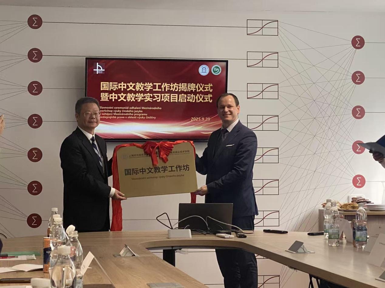捷克时间9月29日上午,国际中文教育工作坊揭牌仪式暨中文教学实习项目启动仪式在捷克布杰约维采商业技术学院隆重举行。校党委副书记、纪委书记章益国一行,捷克布杰约维采商业技术学院校领导团队,孔子课堂中方负责人郝文钧,国际中文教育学院2025年捷克海外实习团队全体师生共同出席仪式。仪式由国际中文教育学院2025届毕业生、孔子课堂志愿者周梓腾,当地大提琴家瓦兹拉夫共同主持。