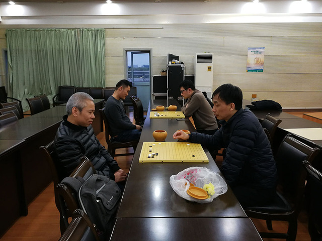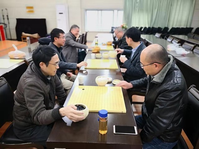 本次活动地点在乐群楼302工会会议室,活动分为两个阶段,内部交流和外部对抗。第一阶段活动于3月18日(周一)17:30至21:00举行,围棋会员参与了活动,进行捉对厮杀(见图1)。第二阶段活动于3月20日(周三)9:00至11:00举行,邀请三位校外专职围棋老师前来指导和交流(见图2)。校外联队领队吴亦楠老师(6D)是我校棋牌协会的外聘围棋指导,张澎和吴震两位老师也是4D实力的高手。协会派出顾振宇、尚宇红、戴永辉等老师与校外高手过招,虽然总比分1:2不敌对手,但戴永辉老师赢得一局是本次交流的一大亮点。对弈胜负判定采用腾讯围棋APP人工智能拍照数子功能,准确率得到一致的认可。活动结束后,按照工会活动细则的相关规定,给参与活动的相关人员发放了奖品。