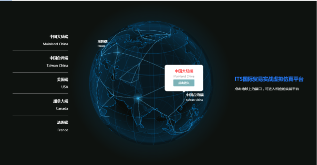 实验在多个实验端口同时开展,如“中国端”、“美国端”、 “加拿大端”、“法国端”等。学生根据所在地在相应的端口注册成立虚拟公司,以公司经营团队的身份,在开放仿真的国际商务环境中自主运作国际贸易公司,全方位模拟真实企业的国际货物买卖活动。