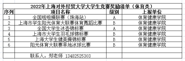 2022年上海对外经贸大学学生竞赛奖励清单(体育类)如下所示: