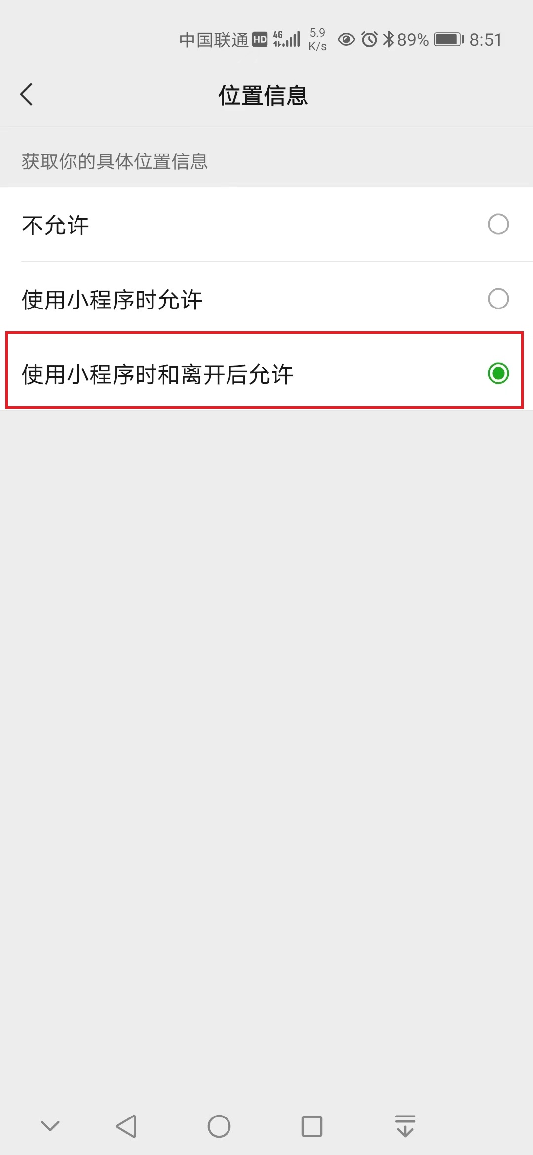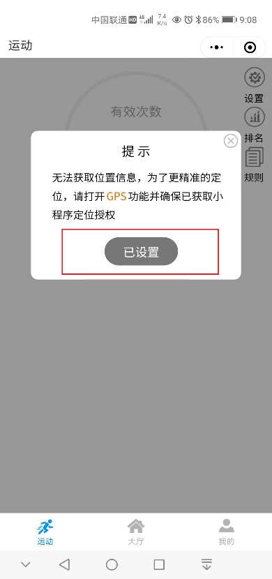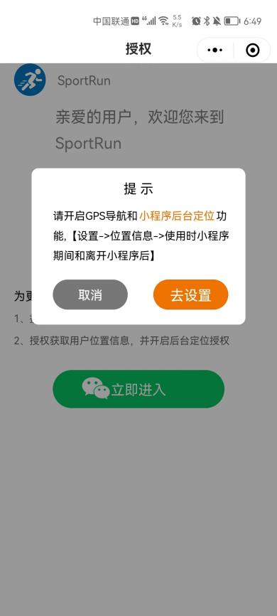 (1)在运动界面,长按跑步,进入授权页面。点击立即进入,弹出提示,选择去设置,进入权限设置页面,选择“位置信息”,选择“使用小程序时和离开后允许”选项,多次点击“返回按钮”回到首页;