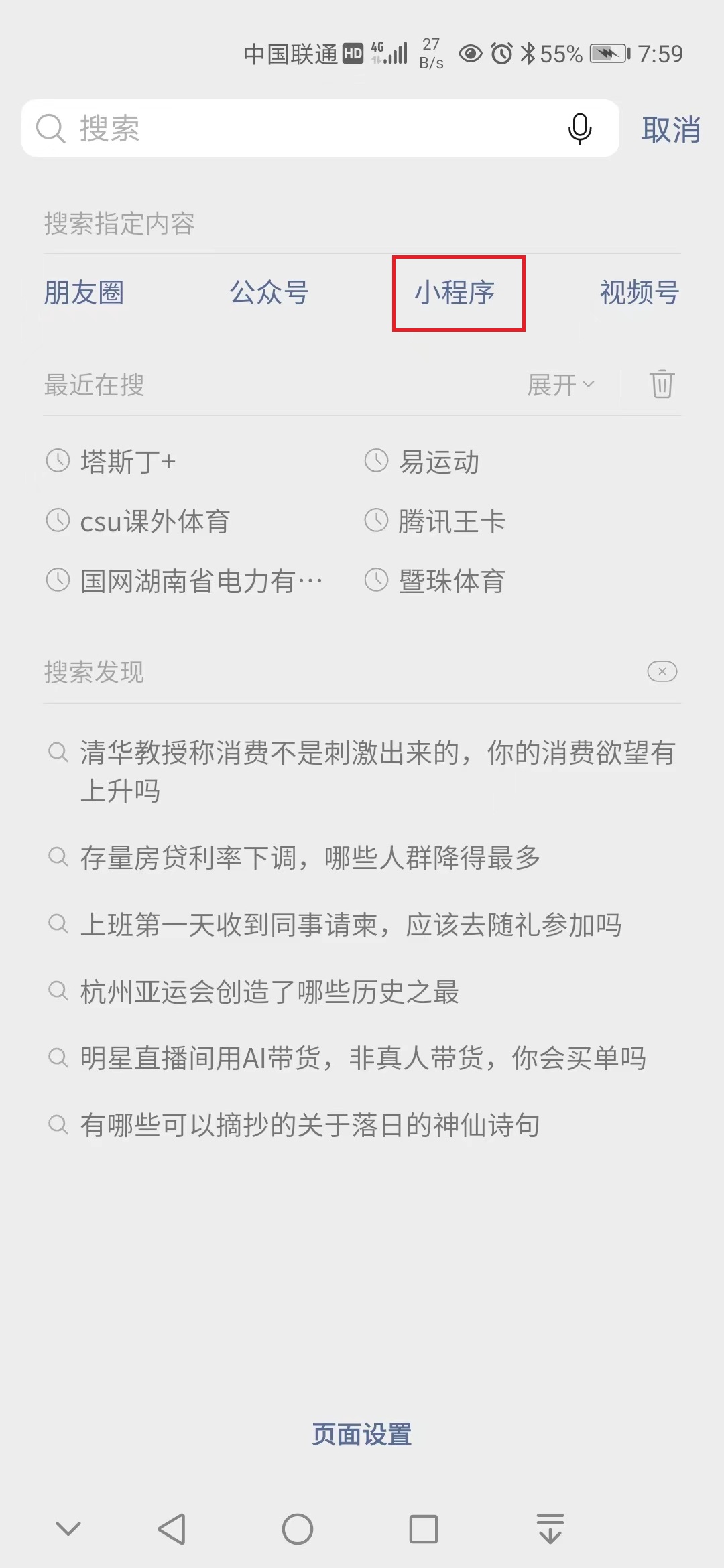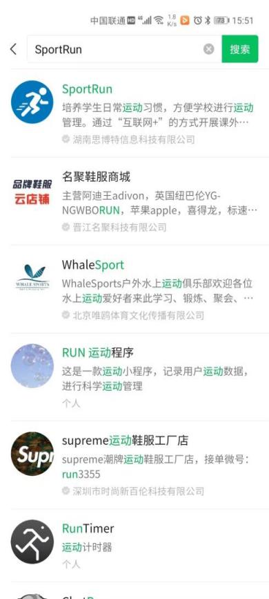 (2)打开微信-点击放大镜图标-指定搜索内容为小程序-输入SportRun-点击搜索-选择SportRun