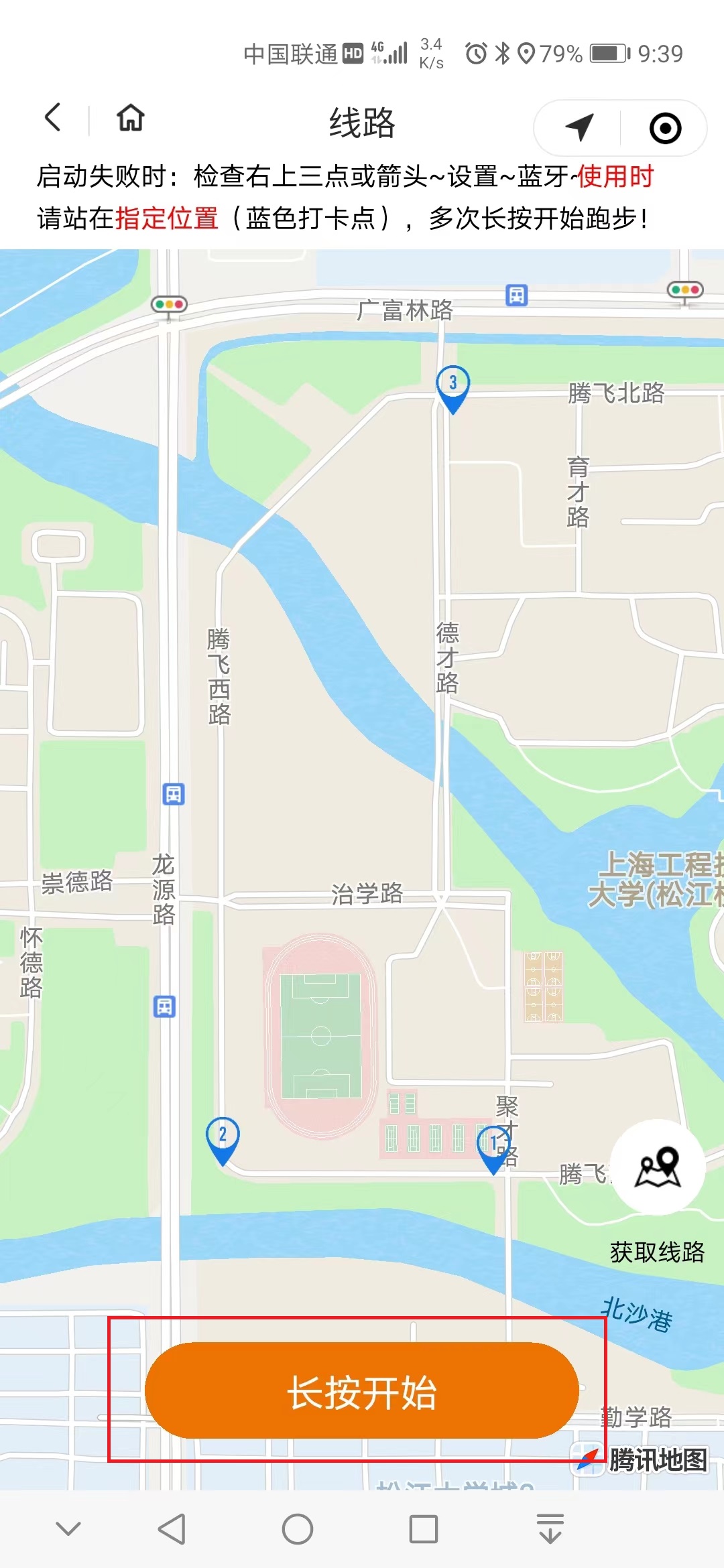 (1)长按跑步进入线路页面;点击右下角“获取线路”;前往蓝色指定打卡点,长按开始。
