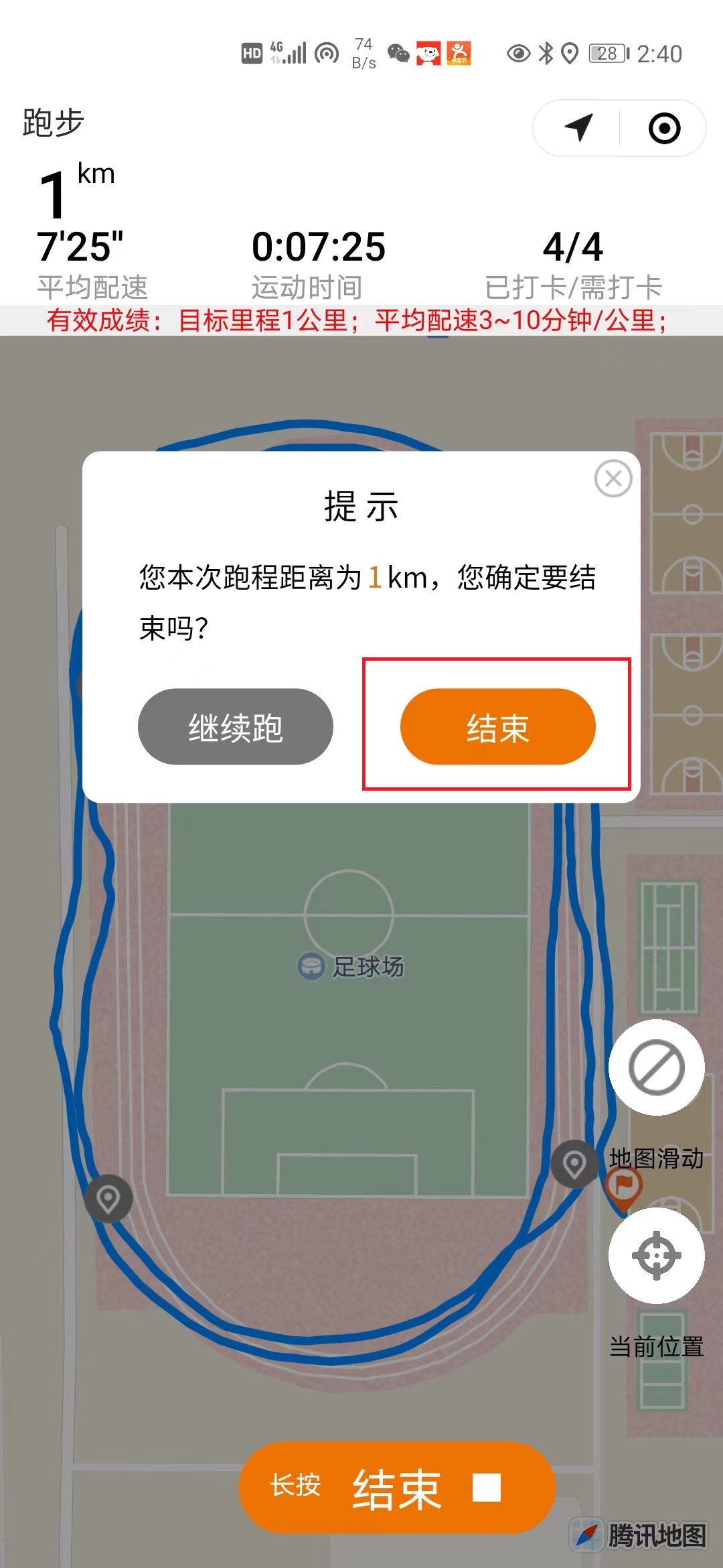 (2)长按结束按钮,小程序提示本次锻炼是否有效;点击继续,继续完成锻炼。点击结束,完成锻炼,回到首页。