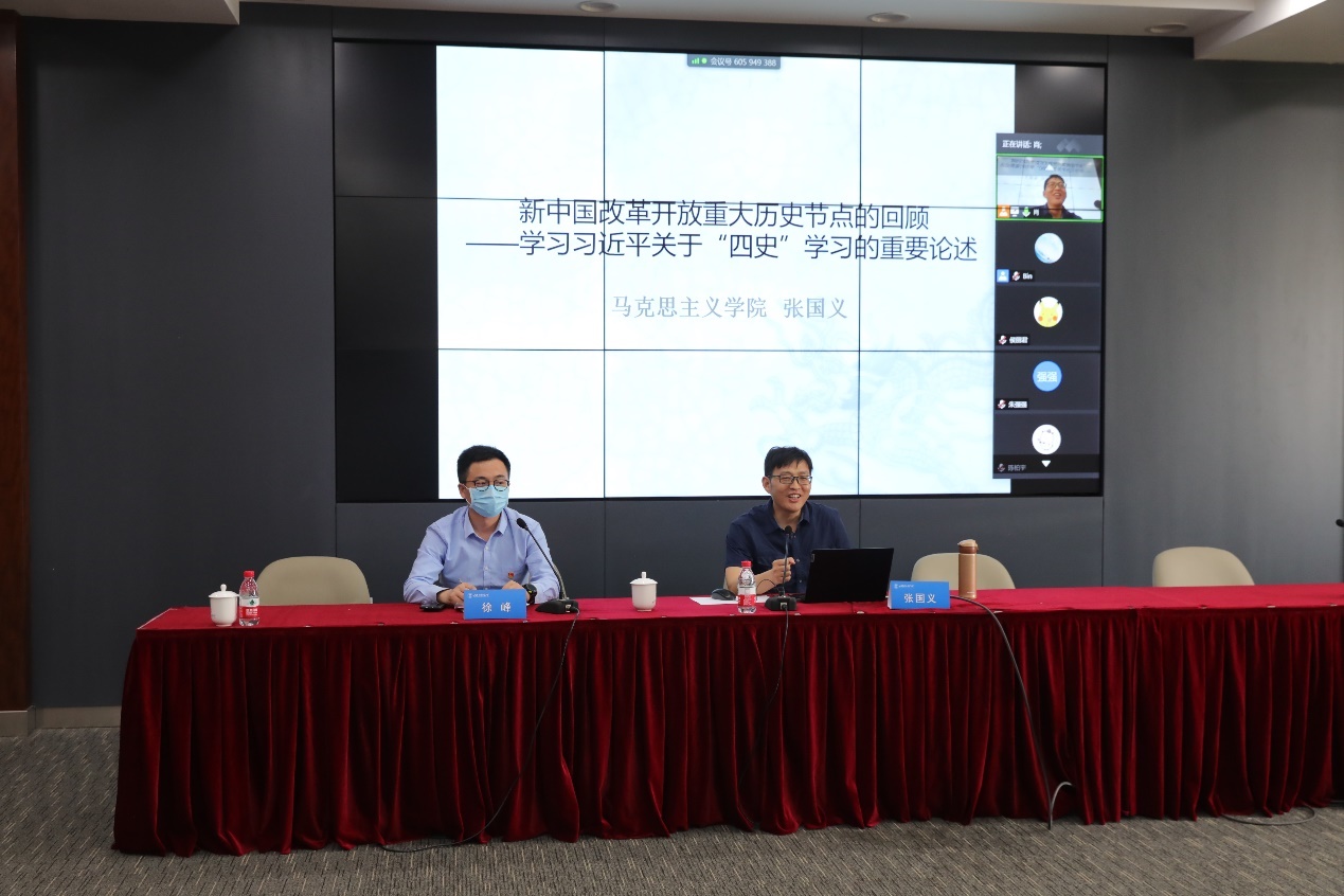 在专题党课篇,校“四史”宣讲团成员、马克思主义学院副教授张国义作了题为《新中国改革开放历史关节点的回顾及启示——学习习近平关于“四史”学习的重要论述》的讲座。