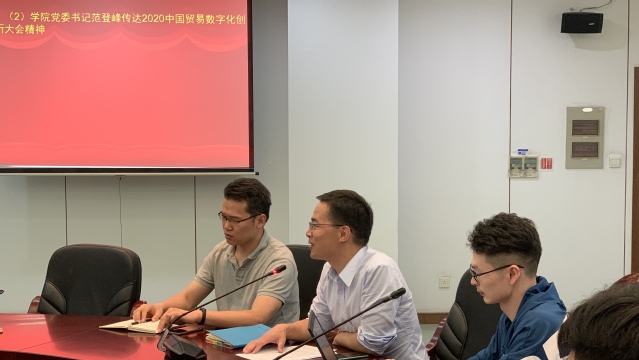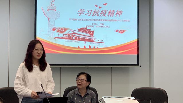 这一环节,团支部书记任萌同学结合PPT领学了《习近平总书记在全国抗击新冠肺炎疫情表彰大会上的重要讲话》,分享了自己对抗“疫”斗争过程、抗“疫”“致胜秘诀”以及其中所展示的“中国精神,中国力量,中国担当”的心得体会。党支部宣传委员周昀老师结合PPT,跟大家分享了《中共中央国务院关于推进贸易高质量发展的指导意见》的要点,并表示了立足岗位实际,发挥专业特长,齐心攻坚克难,持续发力第三届进博会主宾国贸易指数研发,服务国家需求的决心和信心。