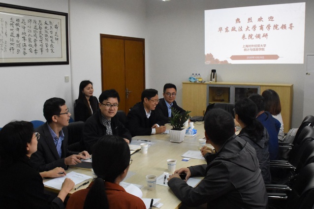 2020年10月28日上午,华东政法大学商学院院长高汉,副院长贾彩彦、李丹,金融学教研室主任童勇,学院办公室主任王芳等一行5人来到统计与信息学院调研。统计与信息学院院长刘永辉,党委副书记徐峰,副院长刘慧、赵倩,数据科学系主任李睿、学院办公室主任陈洁等出席。
