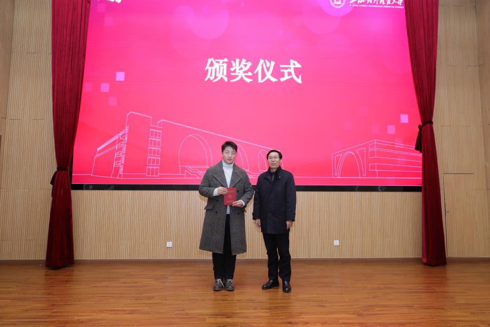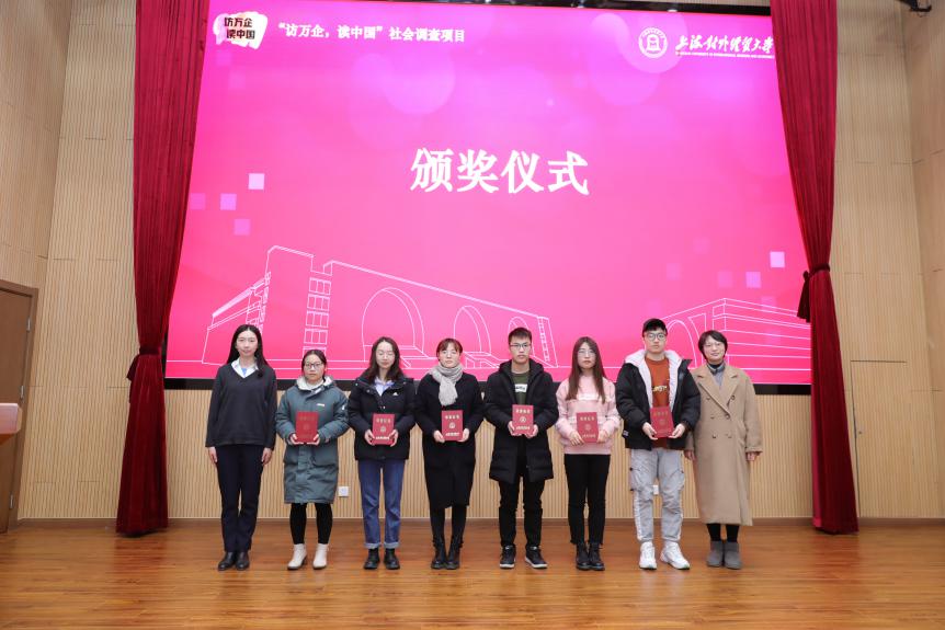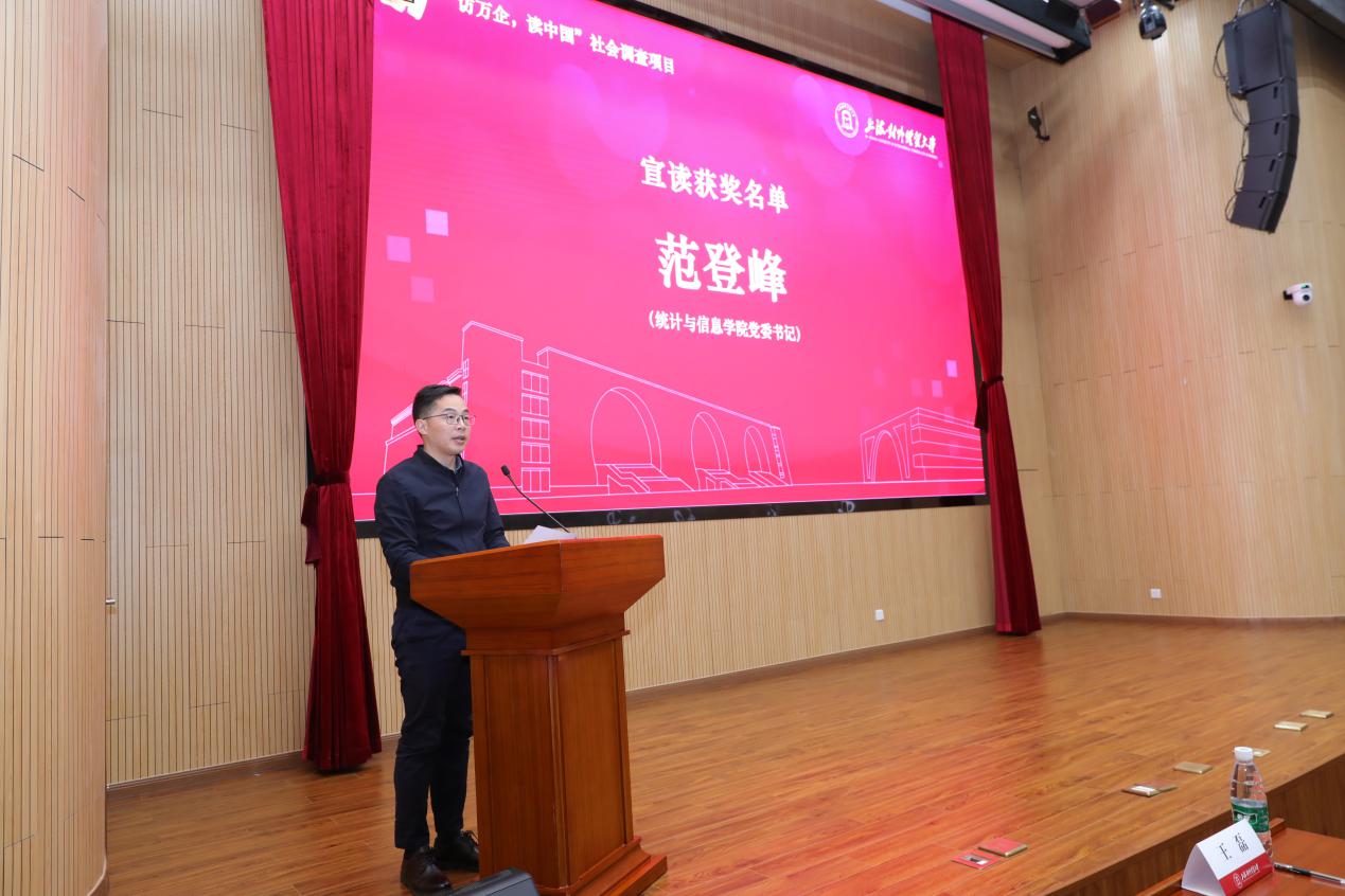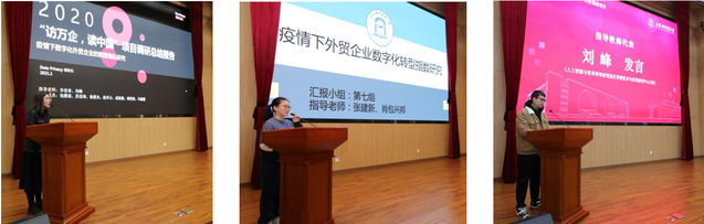 随后,范登峰宣读2020年“访万企,读中国”社会调查项目获奖名单,与会领导嘉宾分别为获奖队伍颁奖。刘峰老师作为指导教师代表进行发言。项目团队代表以“新冠肺炎疫情下外贸企业的数字化转型”为主题展示了实践成果。