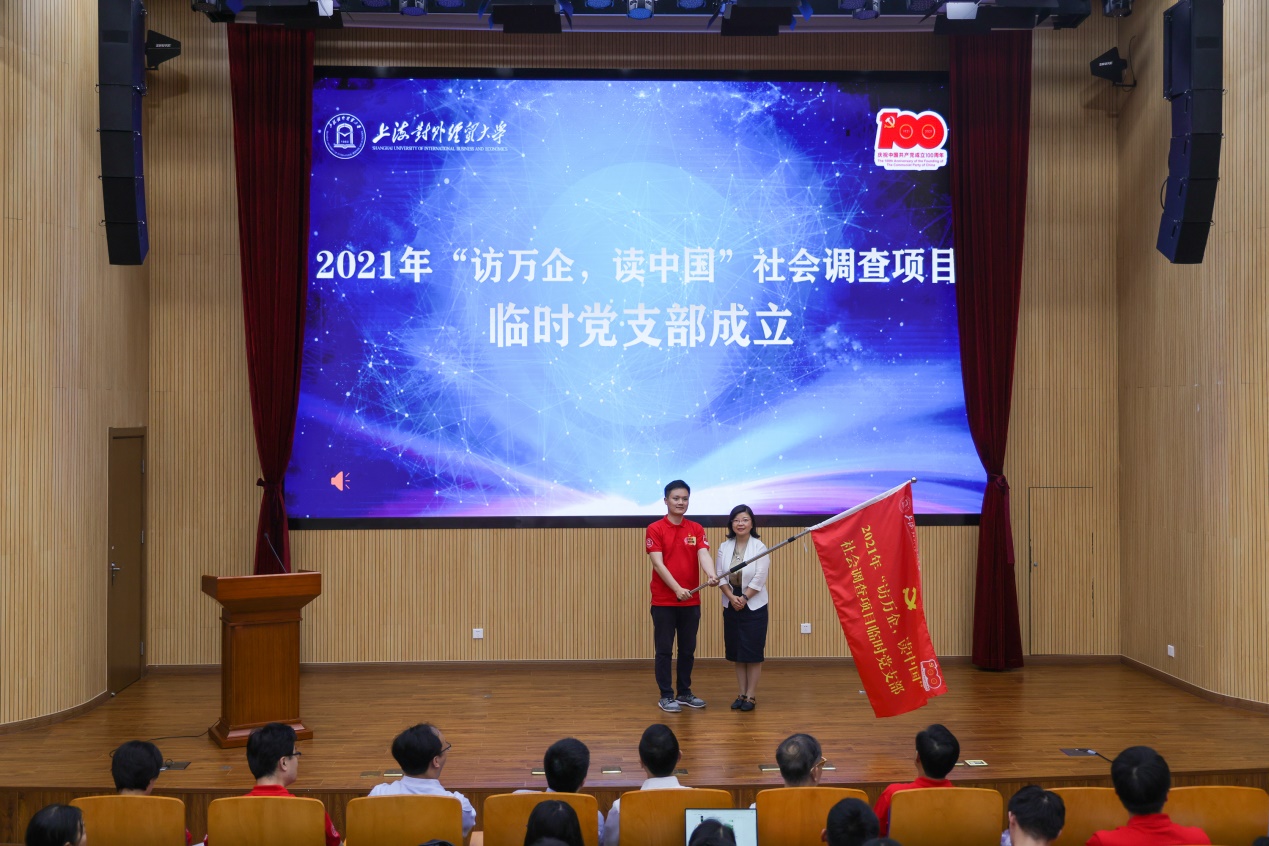 最后,与会领导为2021年“万企调查”项目队长代表授旗。徐永林宣布2021年上海对外经贸大学“访万企,读中国”调研队光荣出征。
